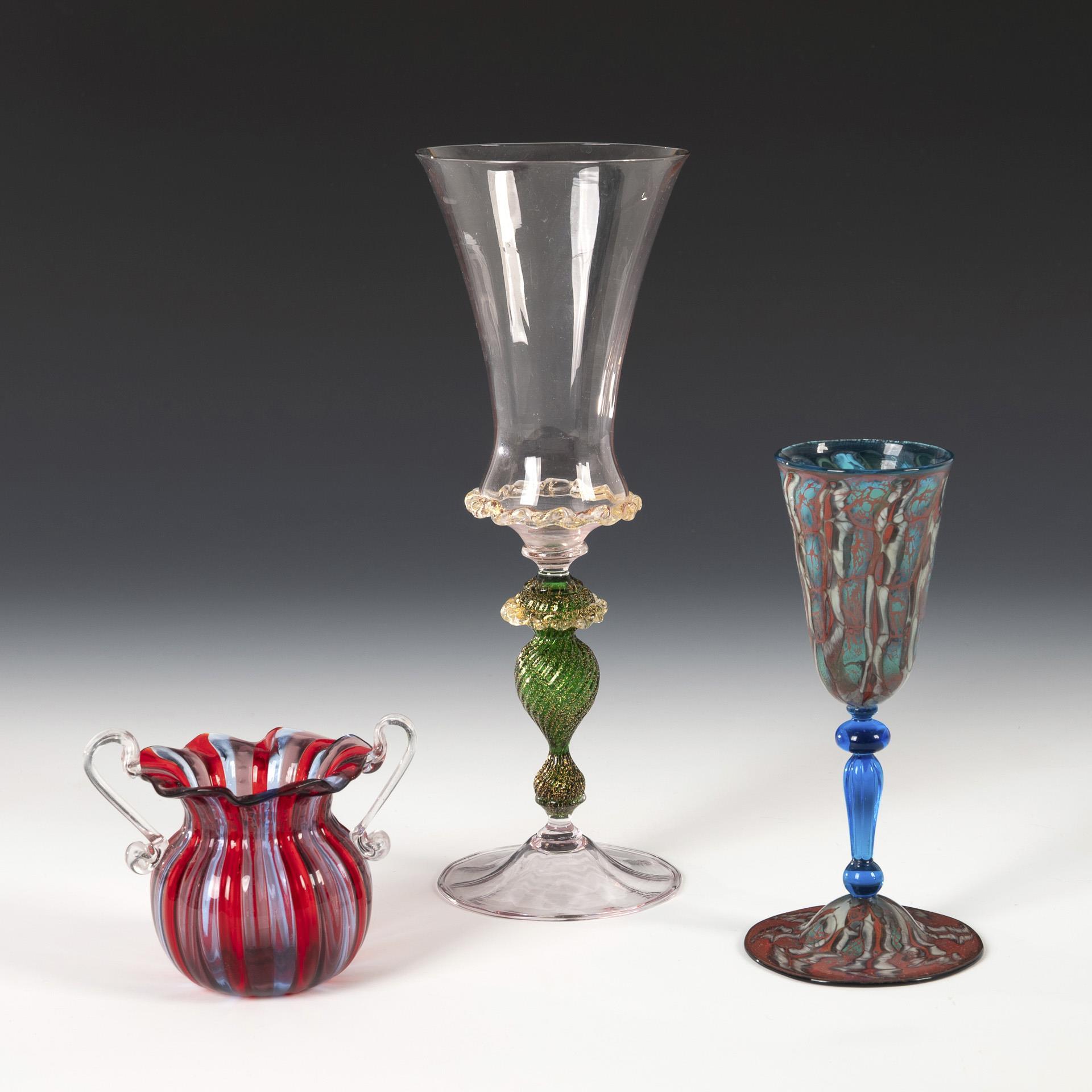 1x signed "A. Boscolo" (= Alessandro Boscolo, Venice): Goblet of multicolored glass (h 17 cm). / 1x optically ribbed goblet glass made of manganese-stained glass with twisted baluster stem made of green glass, gold tinsel fusion (h 26.5 cm). / 1x double-handled vase made of colorless, red, light blue and violet glass (H 9 cm).