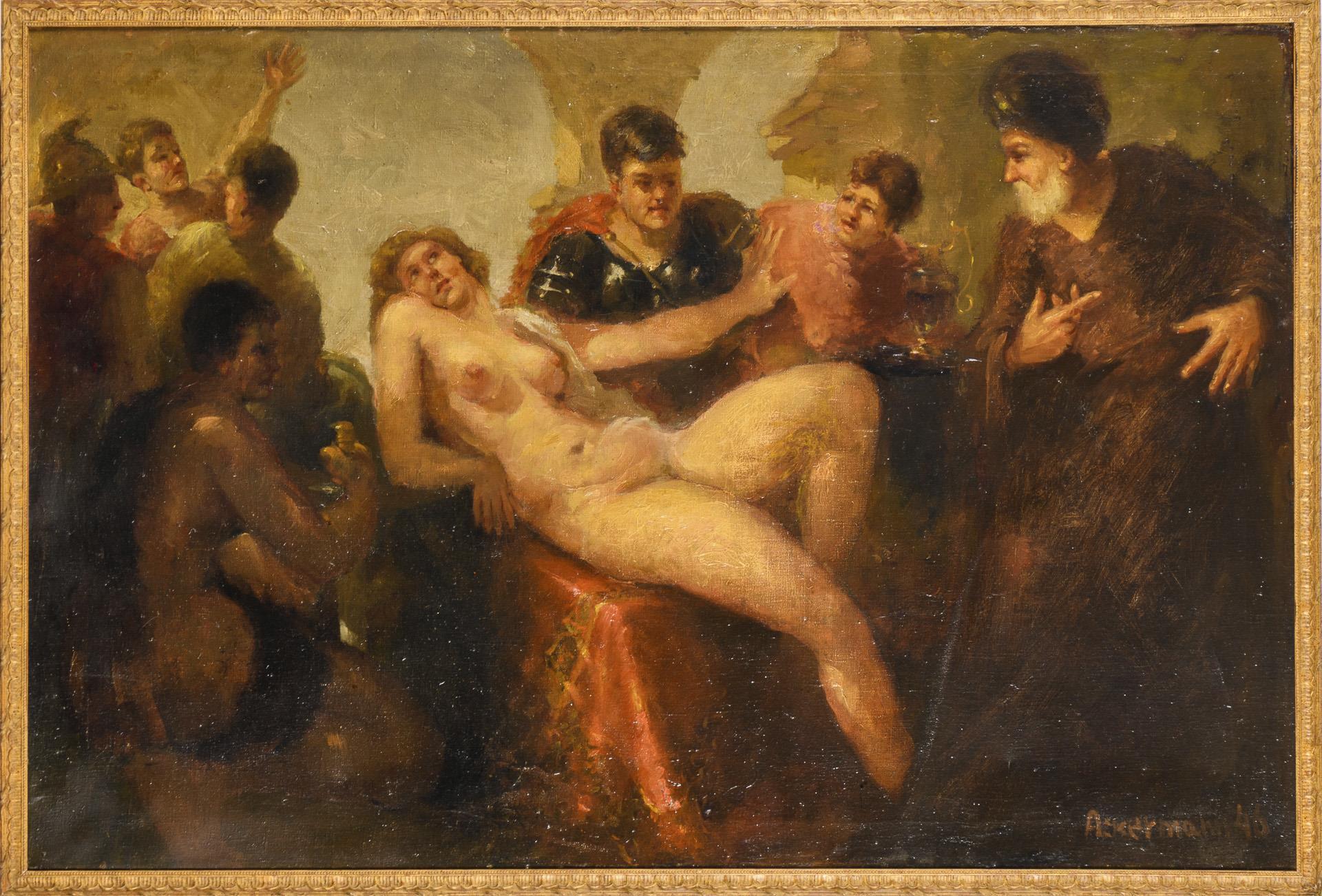 Reclining female nude between men dressed in oriental and ancient Roman costumes. Slight traces of age.