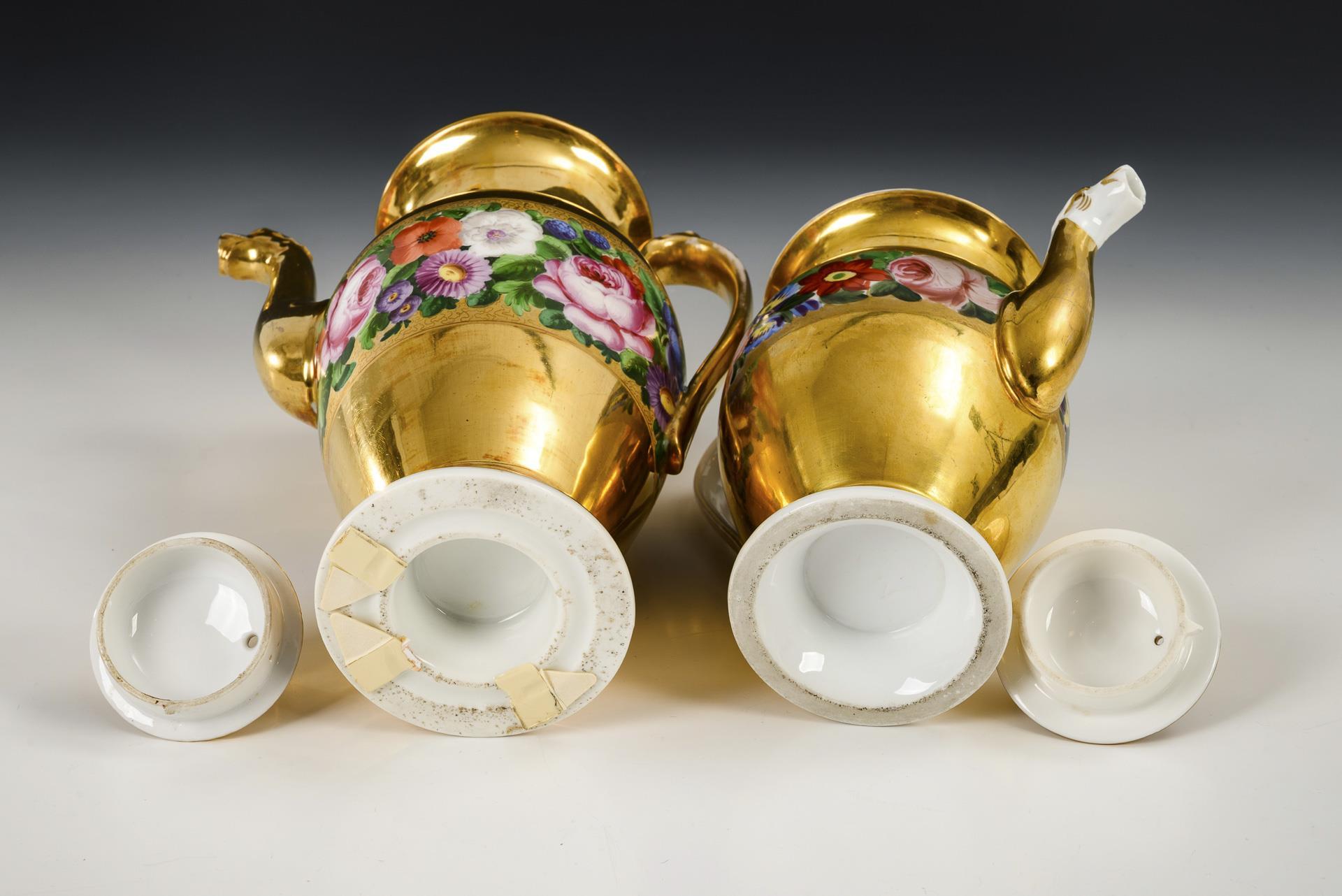 Ovoid jugs with animal head spout, curved handle and pommel lid. Gold ground and a surrounding band with flower painting in front of a gold vermiculé ground. Somewhat crooked stand of the large jug, partial gold abrasion, lid lugs of the large jug missing, 1 lid lug of the small jug chipped.