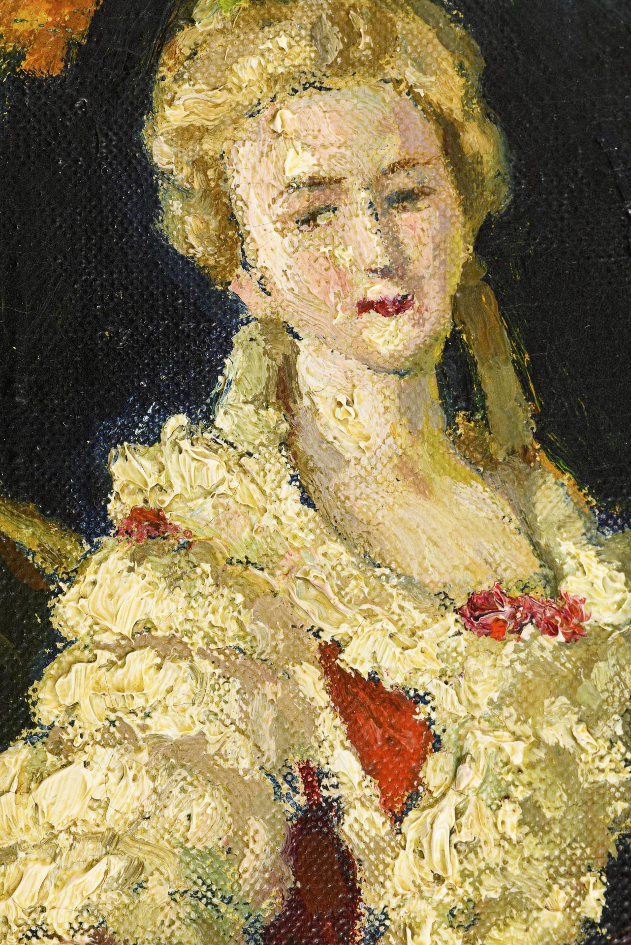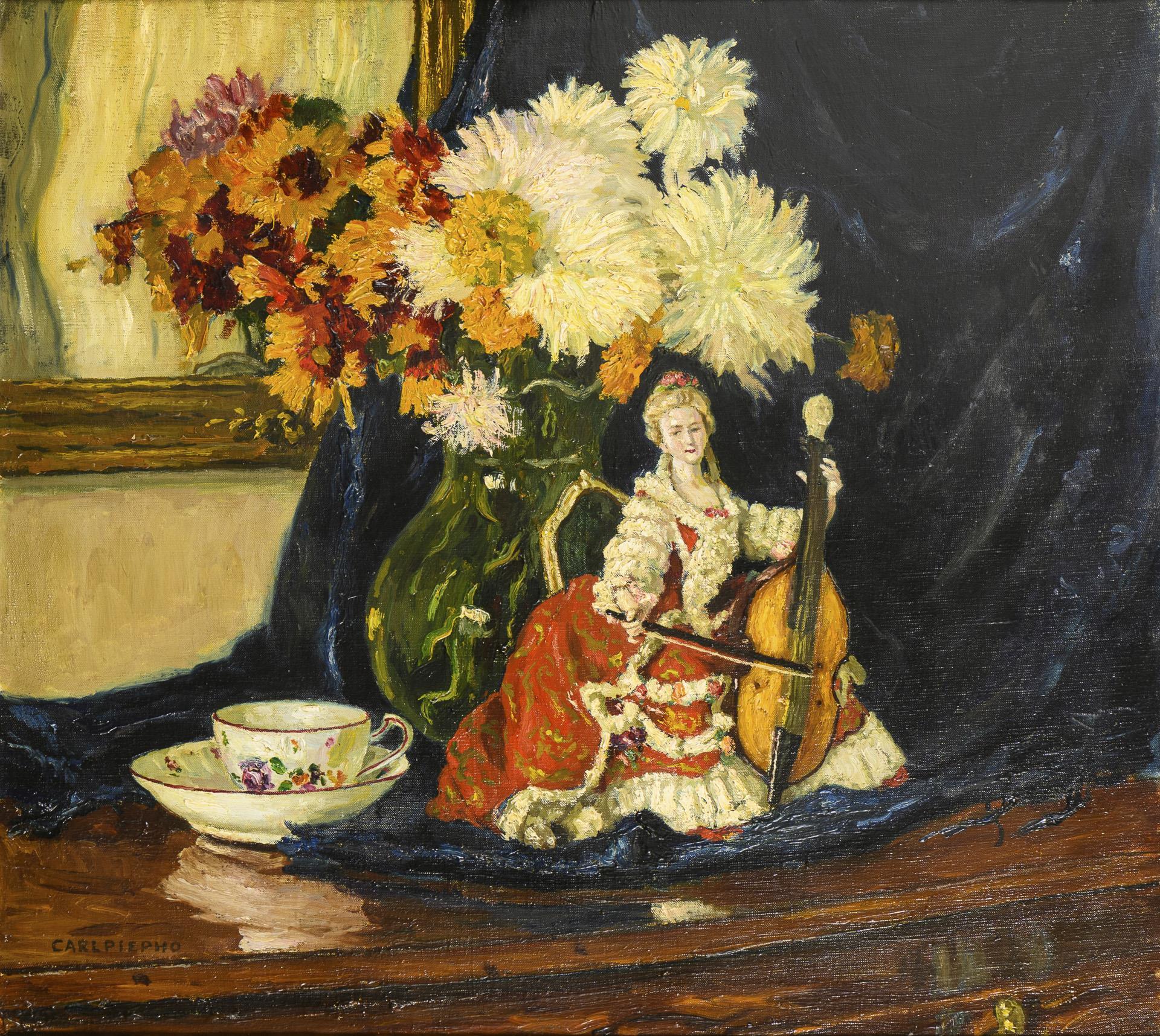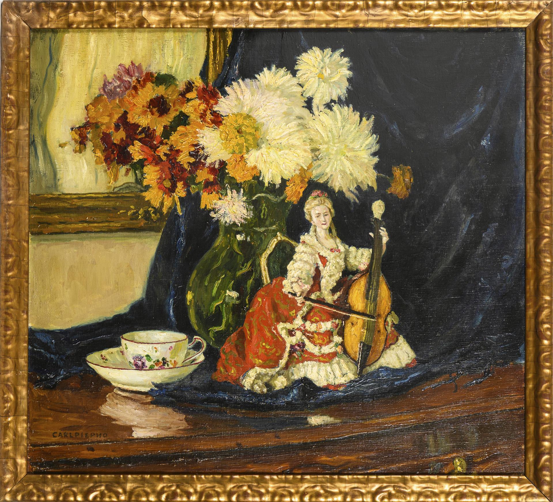 Porcelain figure next to coffee cup and bouquet of flowers in glass vase in front of blue curtain. Two small restored areas.