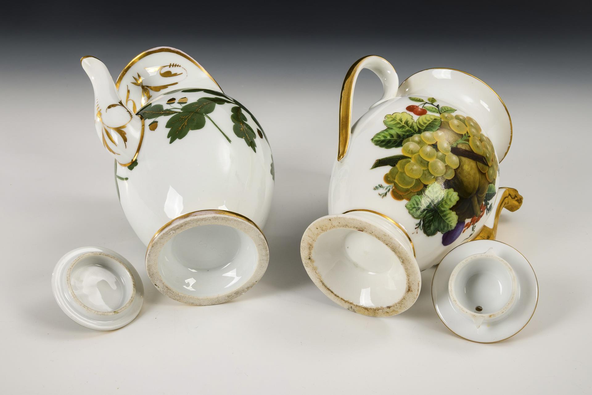 Ovoid coffee pots with tubular spout, round base and knobbed lid. 1x with oak leaf decoration, 1x with a fruit bouquet on both sides. 1x rubbed gold.