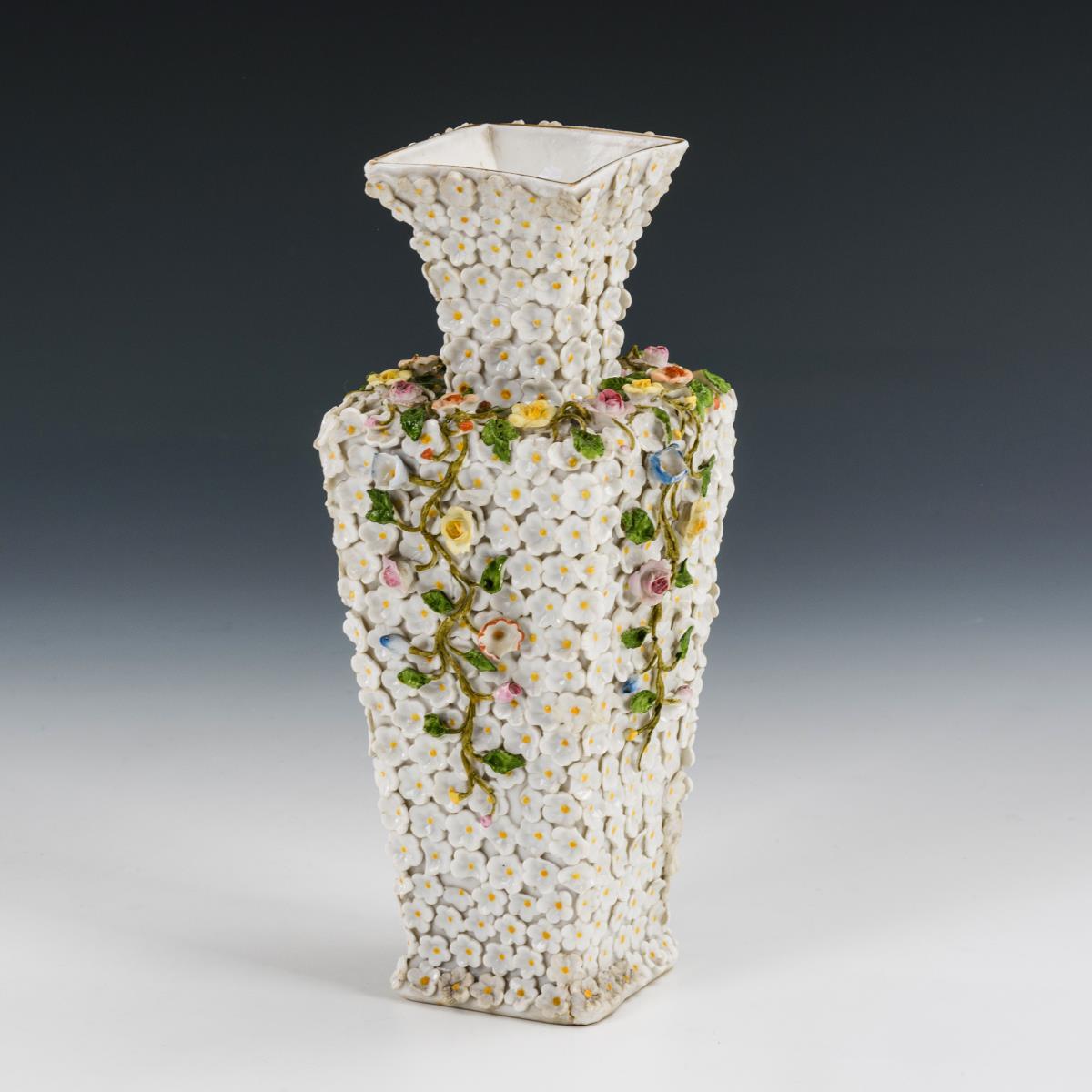 Quadratische Balustervase mit Kraterhals. Dicht mit Blüten und Rosenranken belegt.