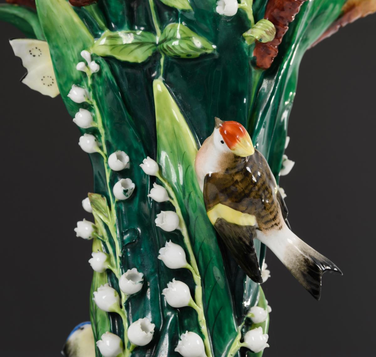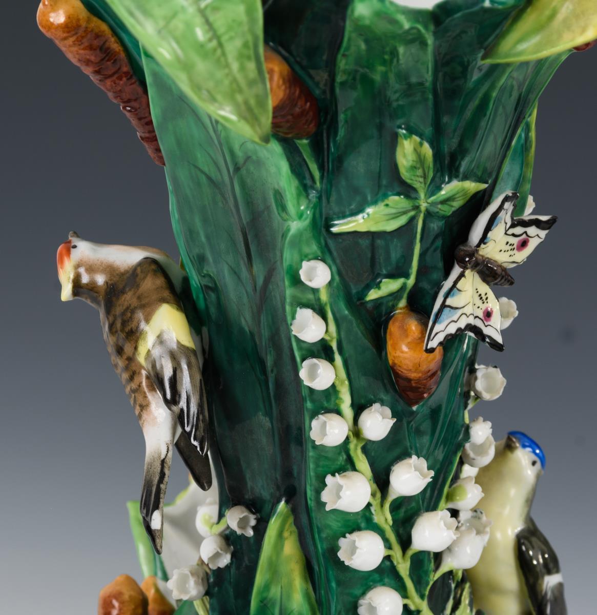 Drei kleinere, aus Schilfblättern gebildete, um eine zentrale große Vase gruppierte Vasen mit plastischen Rohrkolben, Vögeln, Schmetterlingen und Maiglöckchen.