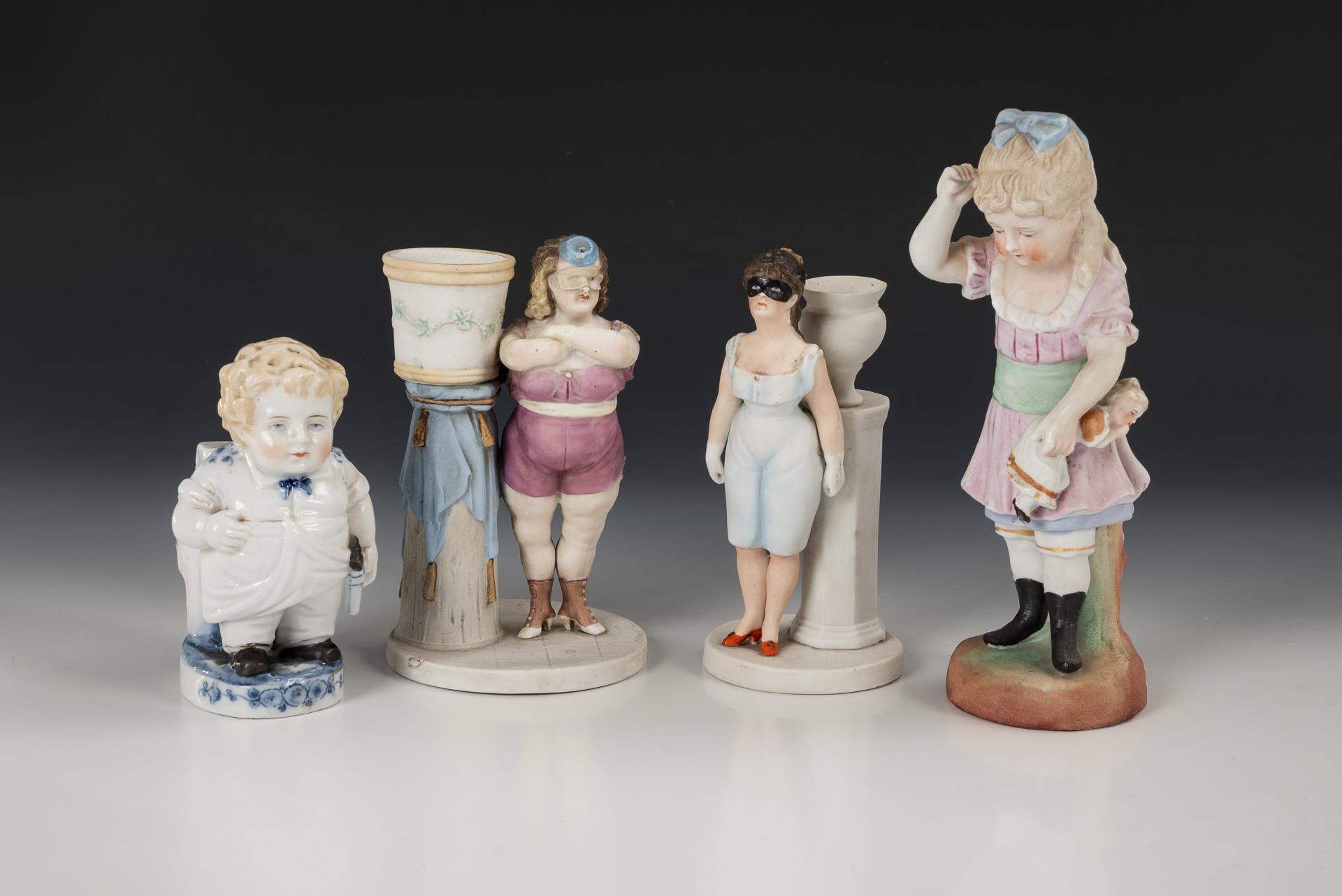2x figure of a prostitute (H 14 cm), each standing on a pedestal with vase. / 1x girl with doll (H 18.5 cm). / 1x boy on a tree trunk as a matchbox holder (H 11.5 cm). 1x chip on the headdress of a lady.