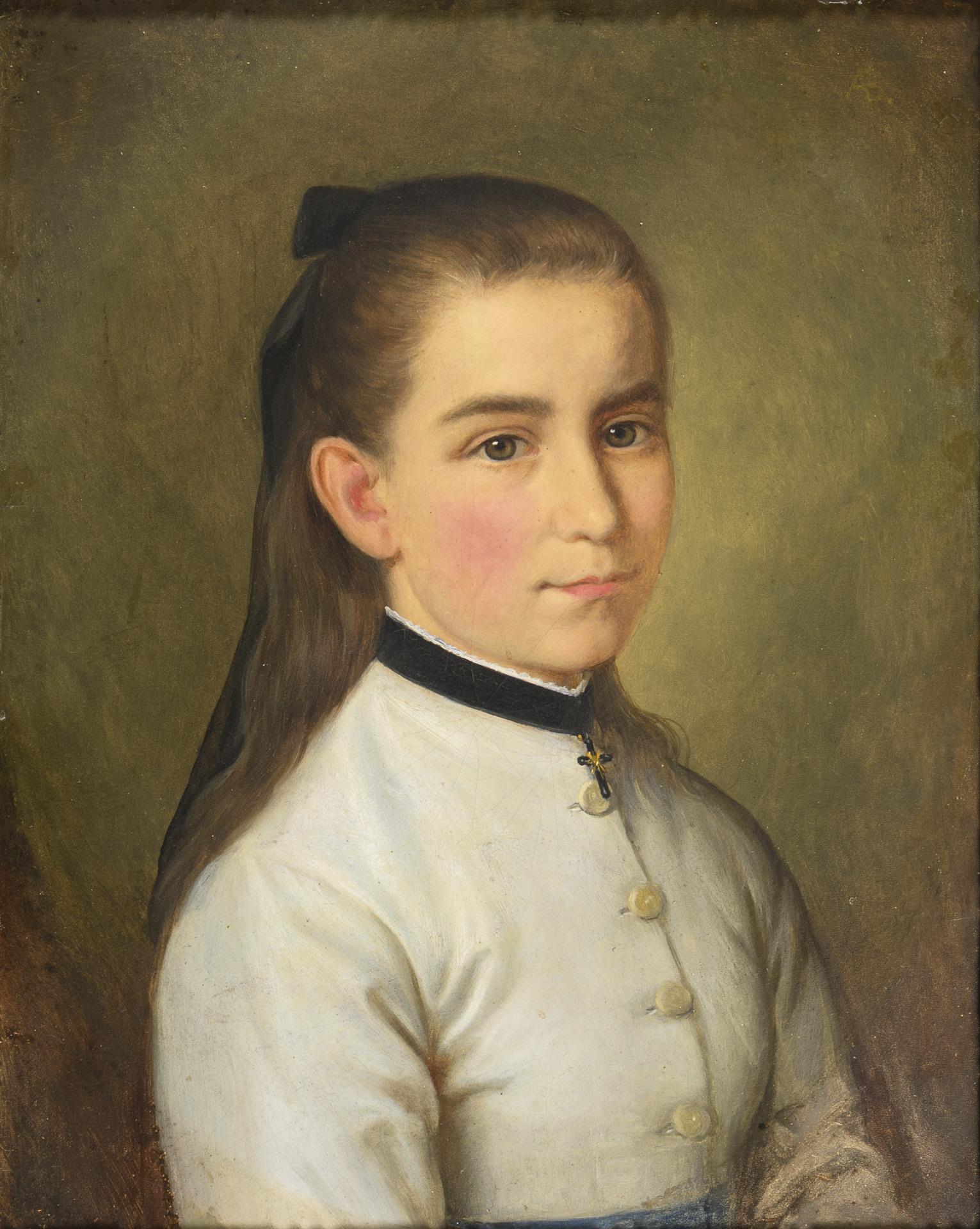 Portrait of Anna Beppler at the age of 12 in a white dress with cross pendant. Slight traces of age.