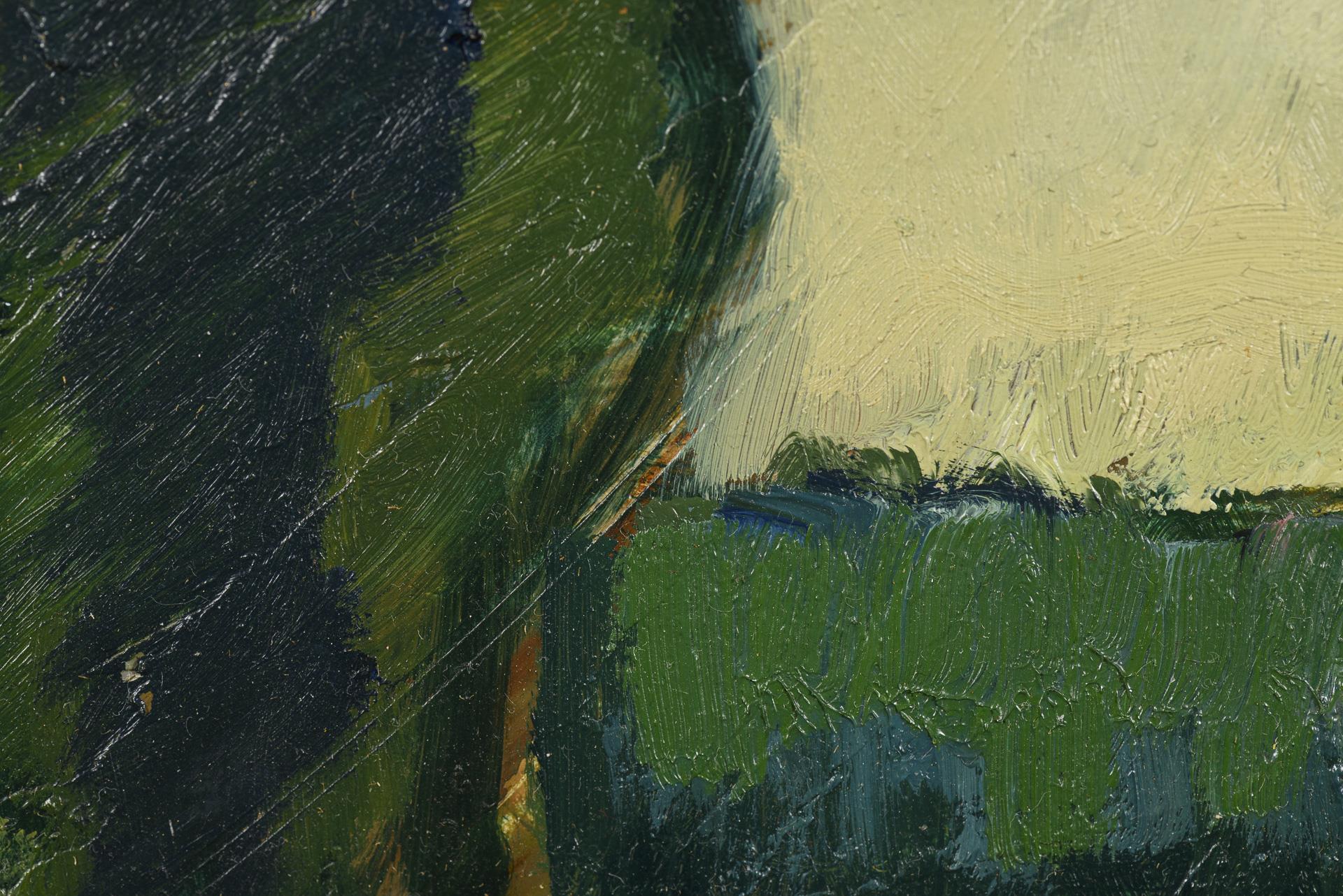 Expressively painted forest and field landscape under a slightly cloudy sky.