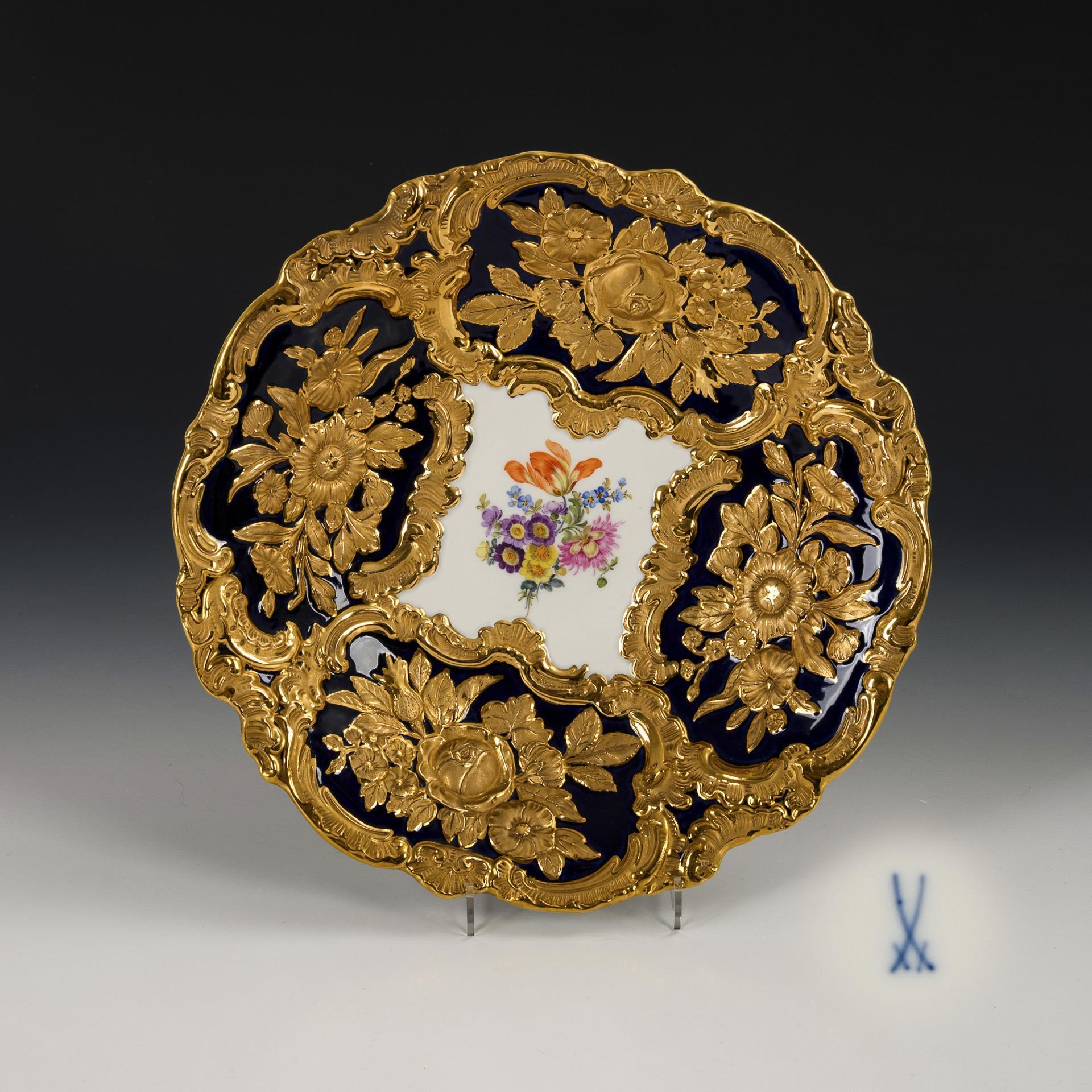 Bowl with gold-bronze floral and rocaille relief, cobalt blue partial ground, in the mirror a floral bouquet with tulip, poppy and auricula.