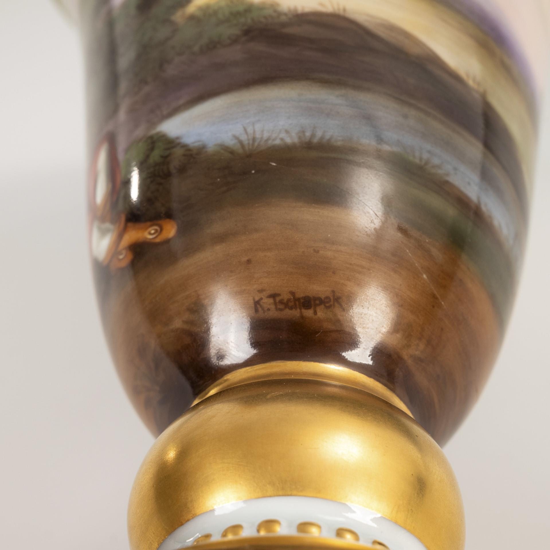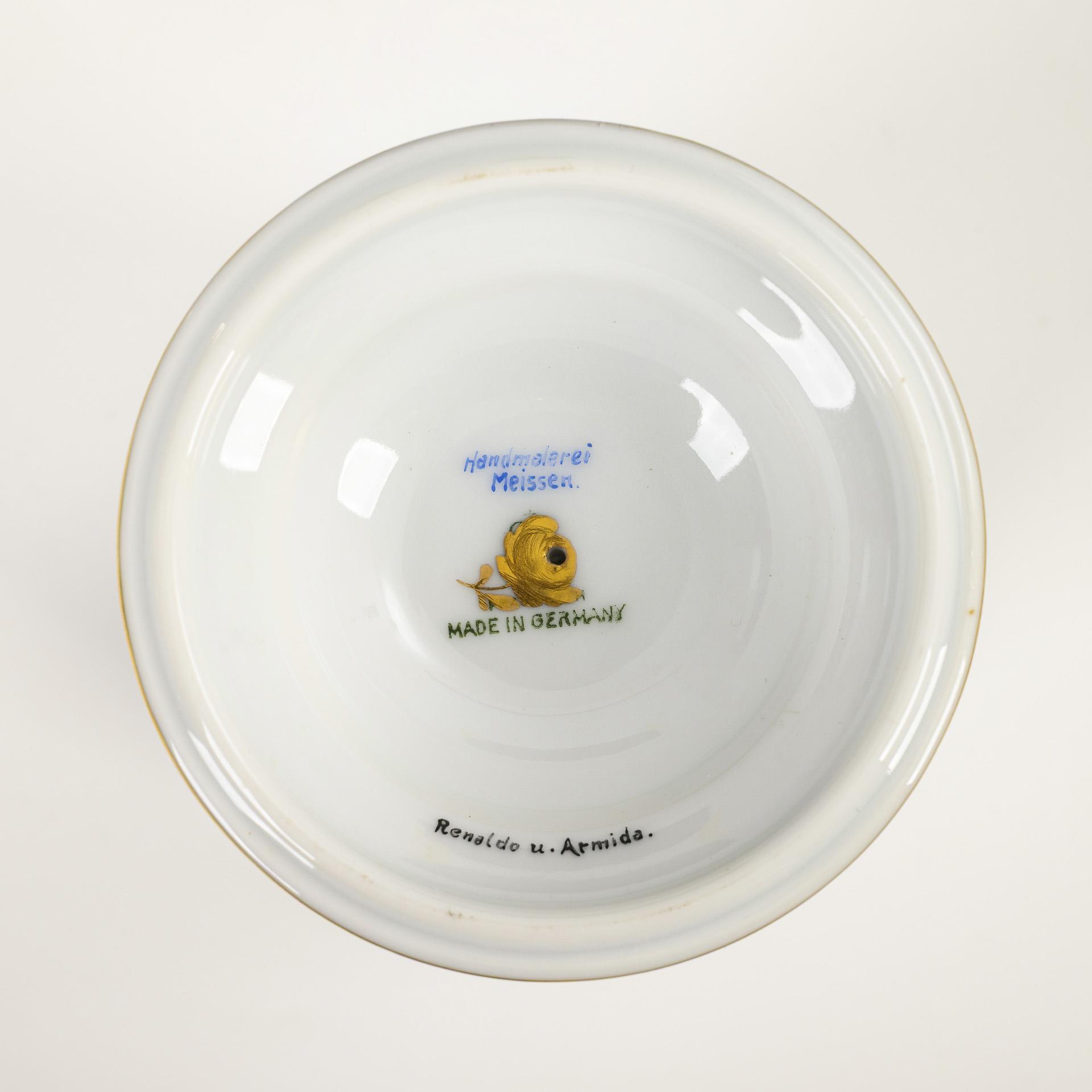 Footed bell vase with knobbed lid. Surrounded by a painted landscape with a pair of lovers seated inside, inscribed "Renaldo und Armida." on the underside. Painting after the opera "Rinaldo" by Georg Friedrich Händel (1685-1759).