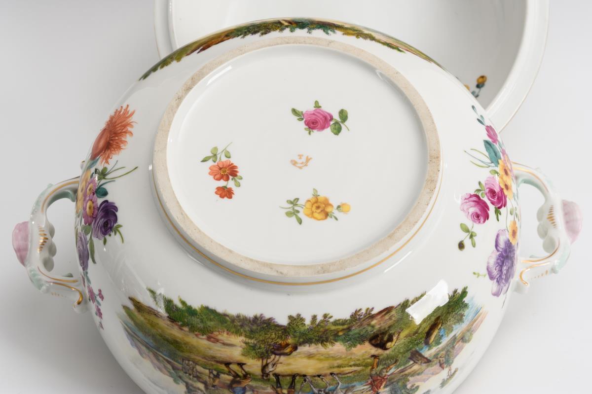 Terrine mit 2 Rocaillehenkeln und Deckel mit Gemüse- und Hummerbelag. Auf der Wandung zwei Soldatenszenen.