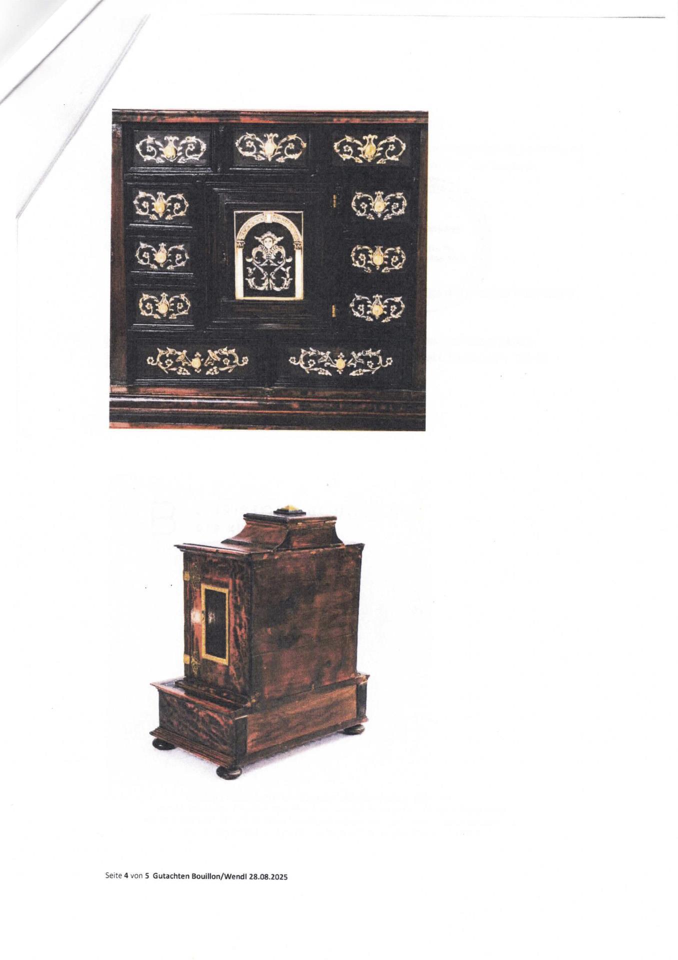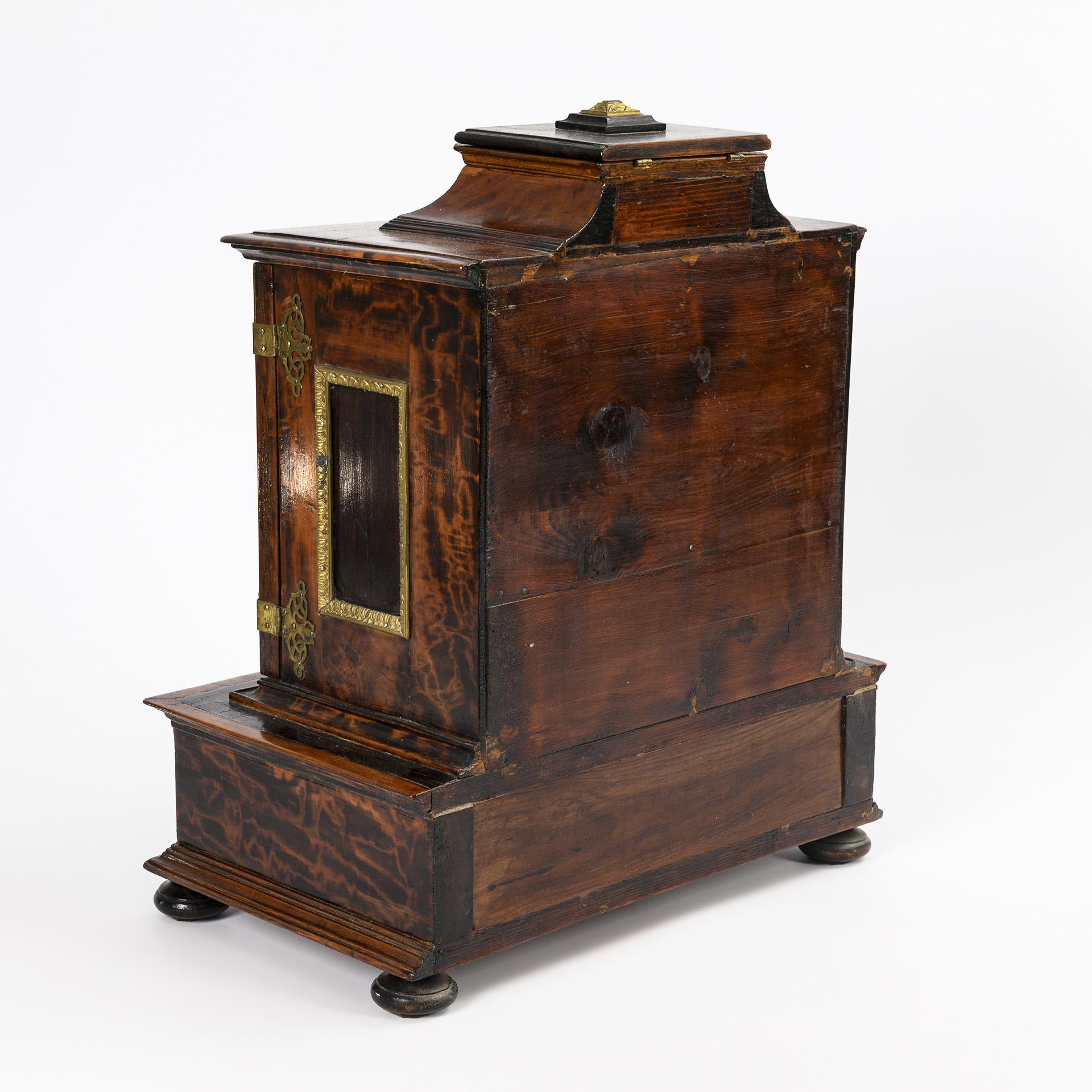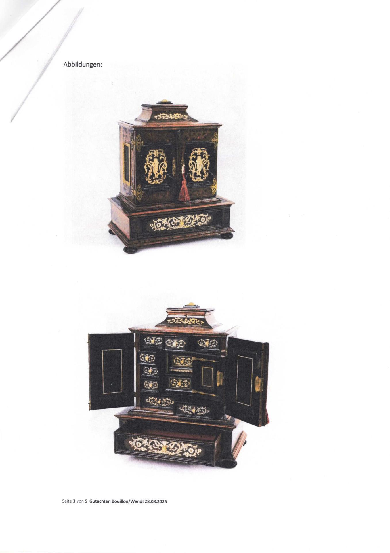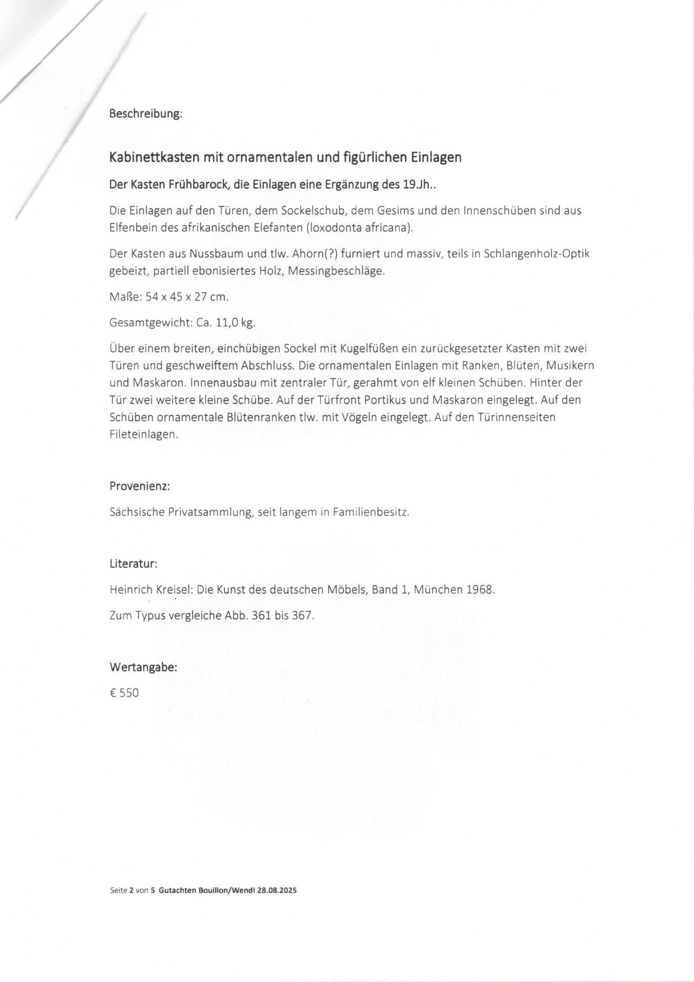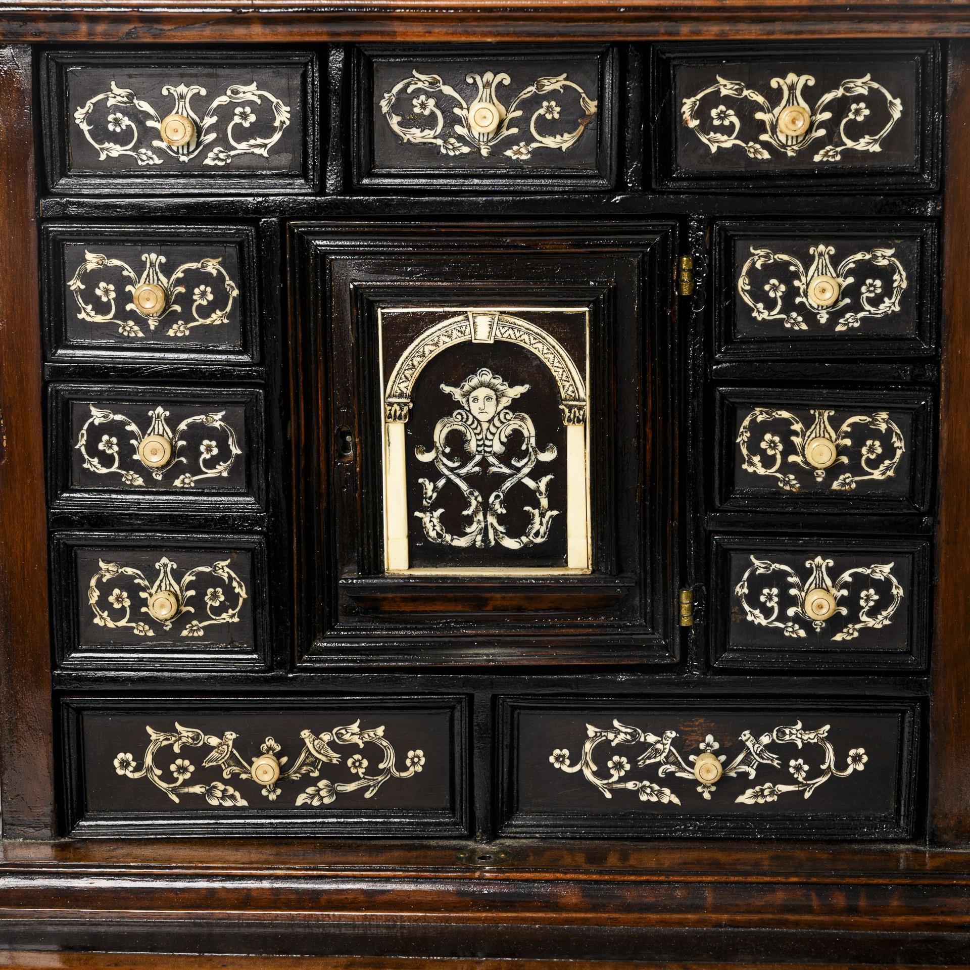 Collector's cabinet standing on pressed ball feet with drawer in the wide plinth area and 2-door body as well as curved top with lockable hinged lid. The front of the cabinet with ornamental ivory inlays, mostly from the 19th century, with musicians, birds and mascarons on the drawer, doors and top. Inside, central door and 11 drawers; ivory inlay with mascaron and ornament in an ivory arcade on the door, ivory ornamental inlays on the drawers. Behind the door 2 further drawers with the same inlays. Restored, with 19th century additions, a few signs of age/use.