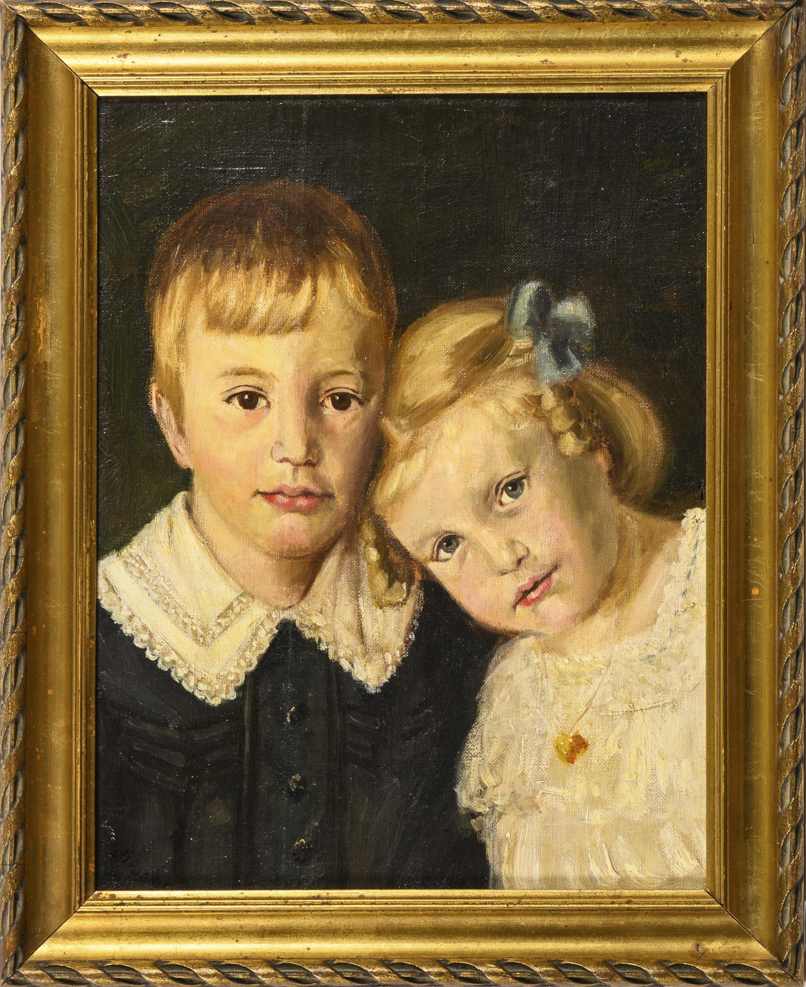 Portrait of a boy and a girl against a dark background. Slight traces of age.