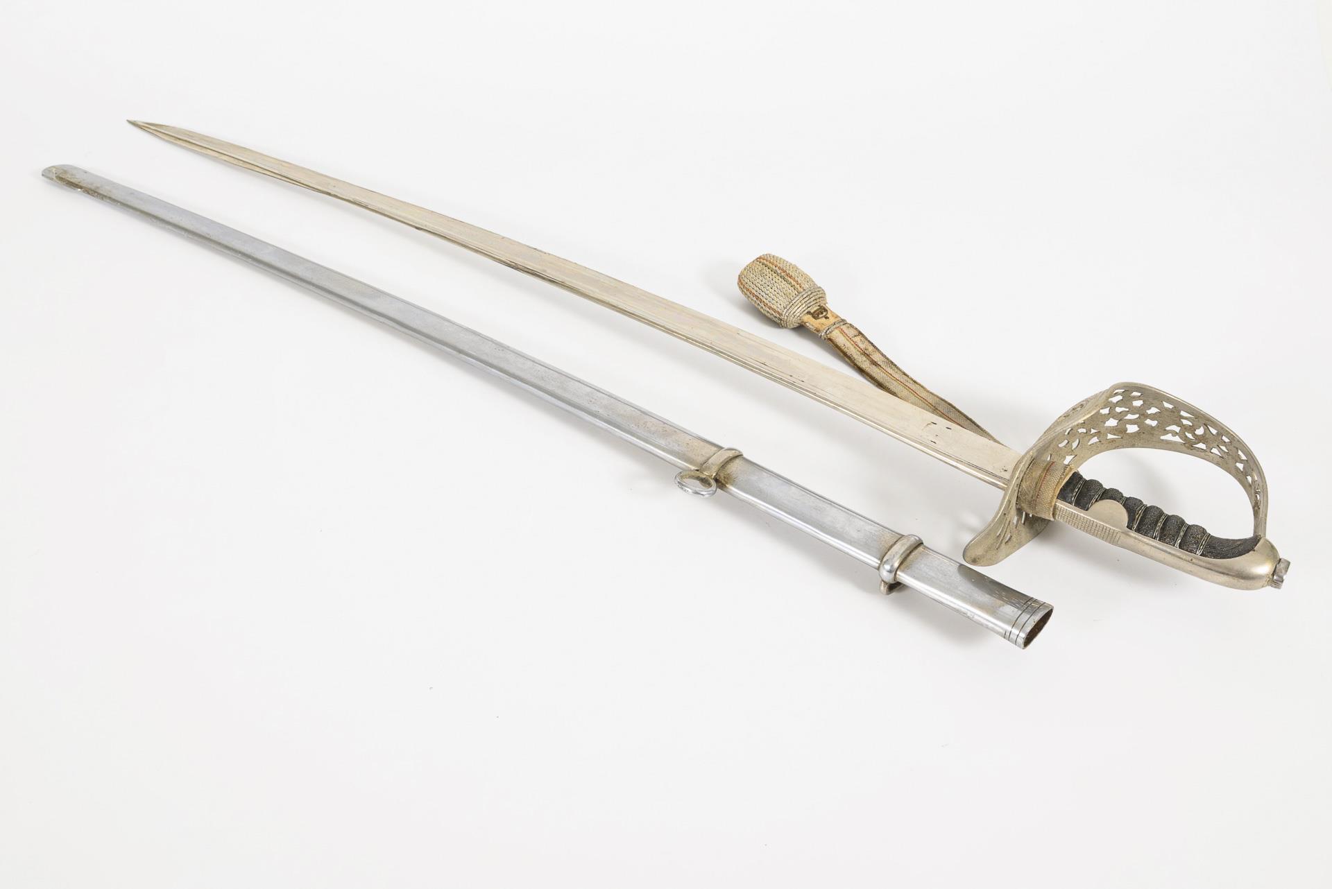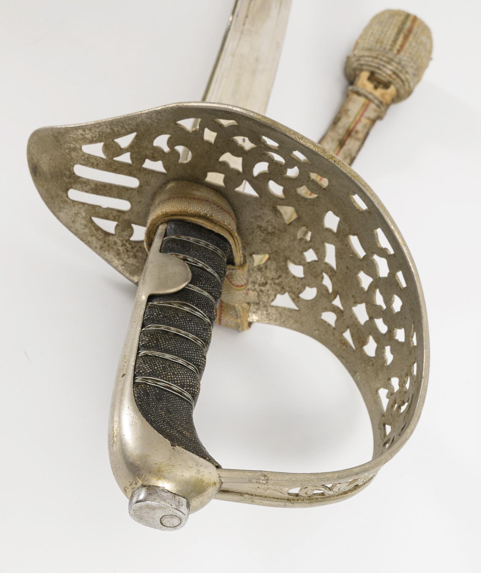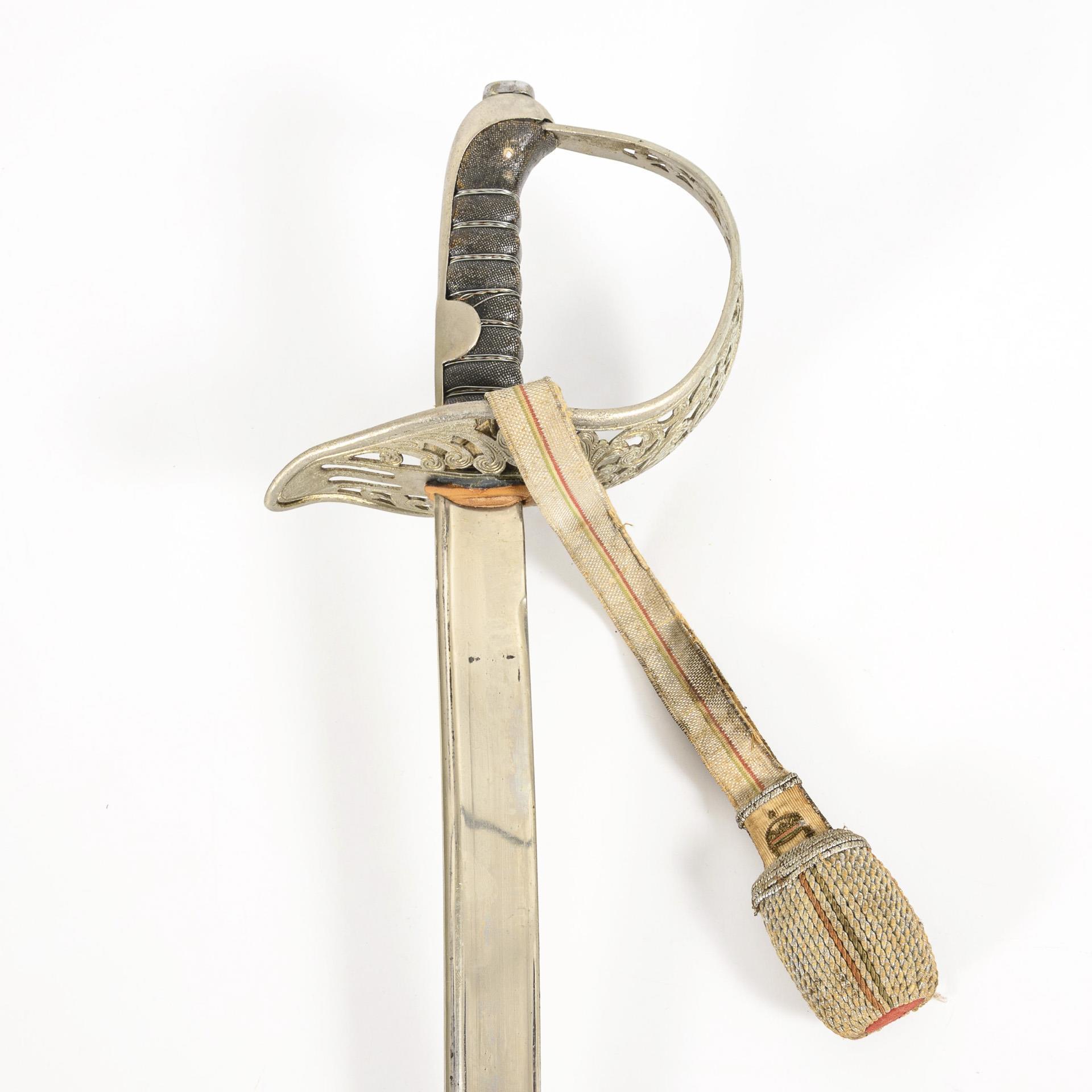À jour three-quarter basket decorated with acanthus scrolls, hilt with galuchat cover and wire winding as well as grip cap with lobes, blade with pinned back, iron scabbard. Portepee with embroidered crown. Traces of rust, especially on the hilt with new coating, otherwise minor signs of age/use.