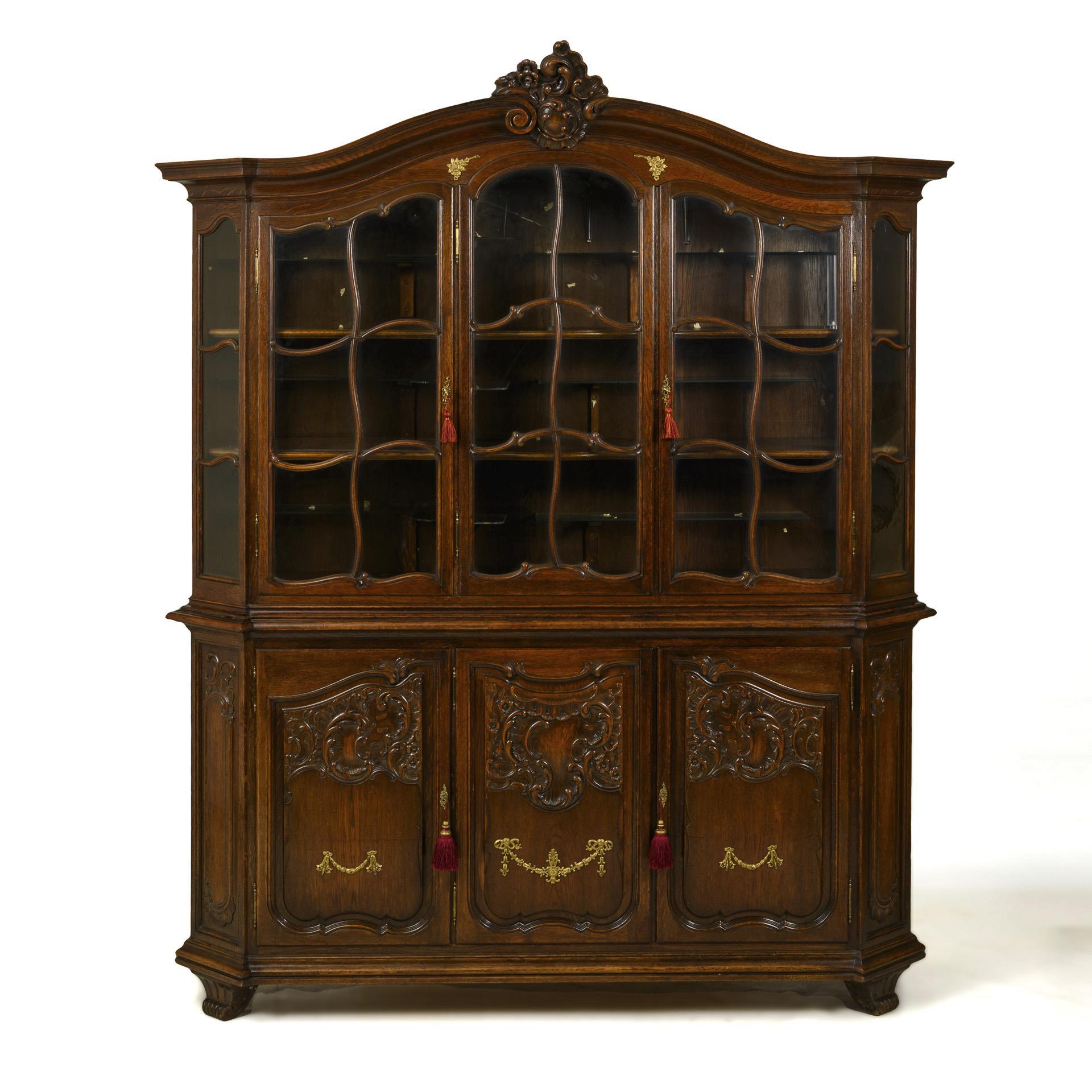 Imposing two-part body with vertically three-part front and slanted sides. 3-door vitrine top with arched gable and curved cornice with floral carving, glazing bars with rocaille moldings. 3-door base cabinet with coffered fronts and relief carvings with shell work and rocailles. On 2 stylized carved paw feet and 2 block feet. Floral bronze mounts. Compartments inside, each with 2 shelves and more recently added tiered shelves with glass and plastic surfaces. 1 pane defective.