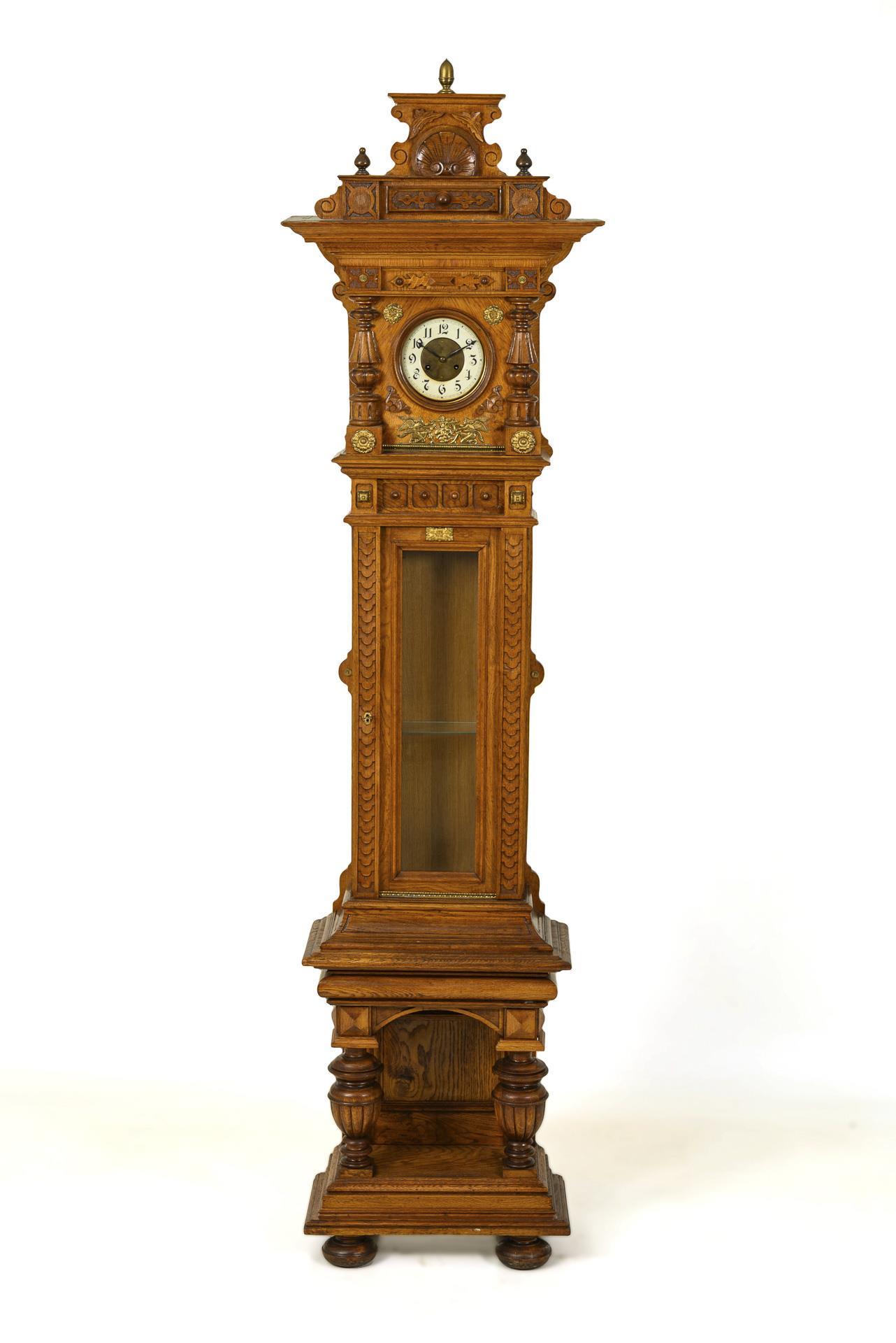 Stately case with decorative pediment, glazed pendulum case as display case compartment with glass shelf, open base with round arch segment and baluster columns, on 4 pressed ball feet. Richly carved with historicist decorative elements, floral brass applications and 1 classicist decorative fitting with putto and winged creatures. Case slightly wobbly.