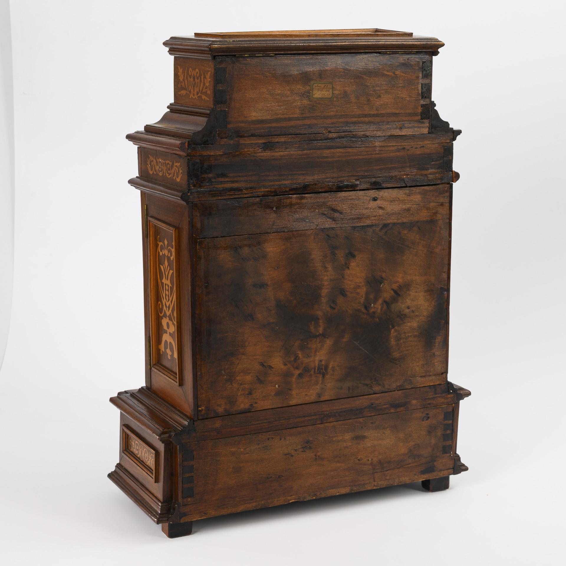 Renaissance-inspired collection cabinet with 3 drawers in a base with central risalit and moldings. 2-door body with drawer in architrave and box-shaped top with hinged lid. Rich ornamental inlays on the front and sides. Inlaid mottoes in the doors and hinged lid. Inside 15 drawers each with ornamental inlays as well as brass knobs and lion masks with pull rings. 1 key and 2 keyhole fittings missing, 2 keys replaced.