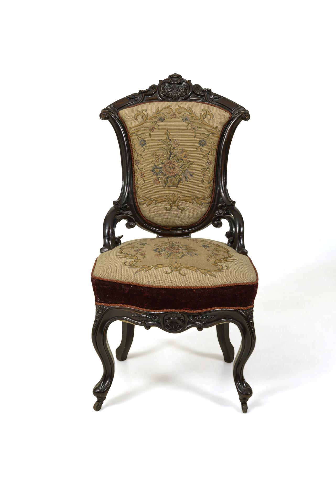 Florally carved chair with curved-rounded frame shape with end volutes and fillets, upholstered backrest and seat with floral patterned fabric cover, on 4 s-shaped curved legs with 2 castor feet at the front. Restored, with additions, 1 missing volute element on the side backrest support.