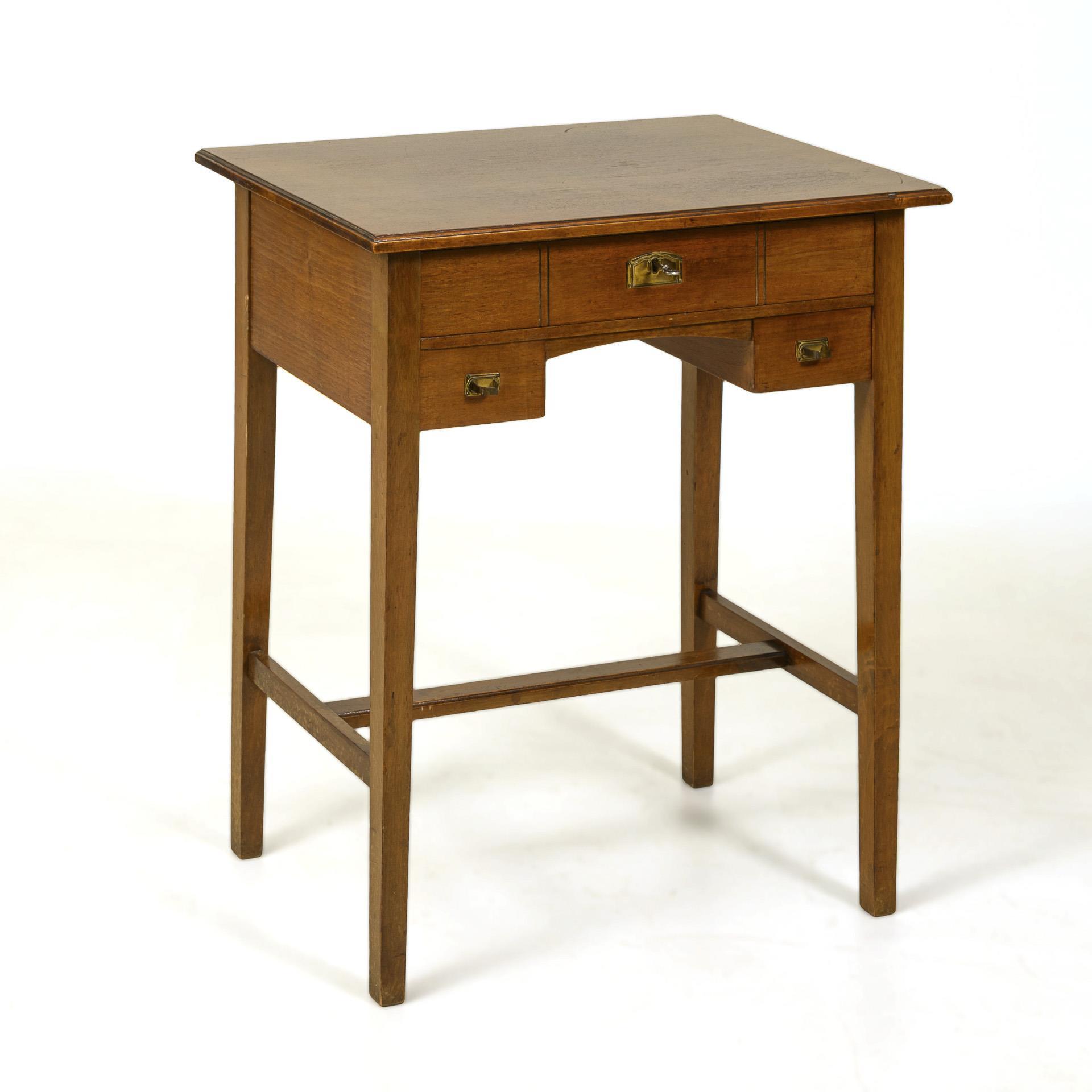 Rectangular top with profiled edge above an indented frame with 3 drawers, on 4 straight legs with cross bracing. Wide drawer with 2 compartments and sliding box. Brass fittings, some with handles. Restored, with additions. Cover plate with scratches, partial defects to the wood.