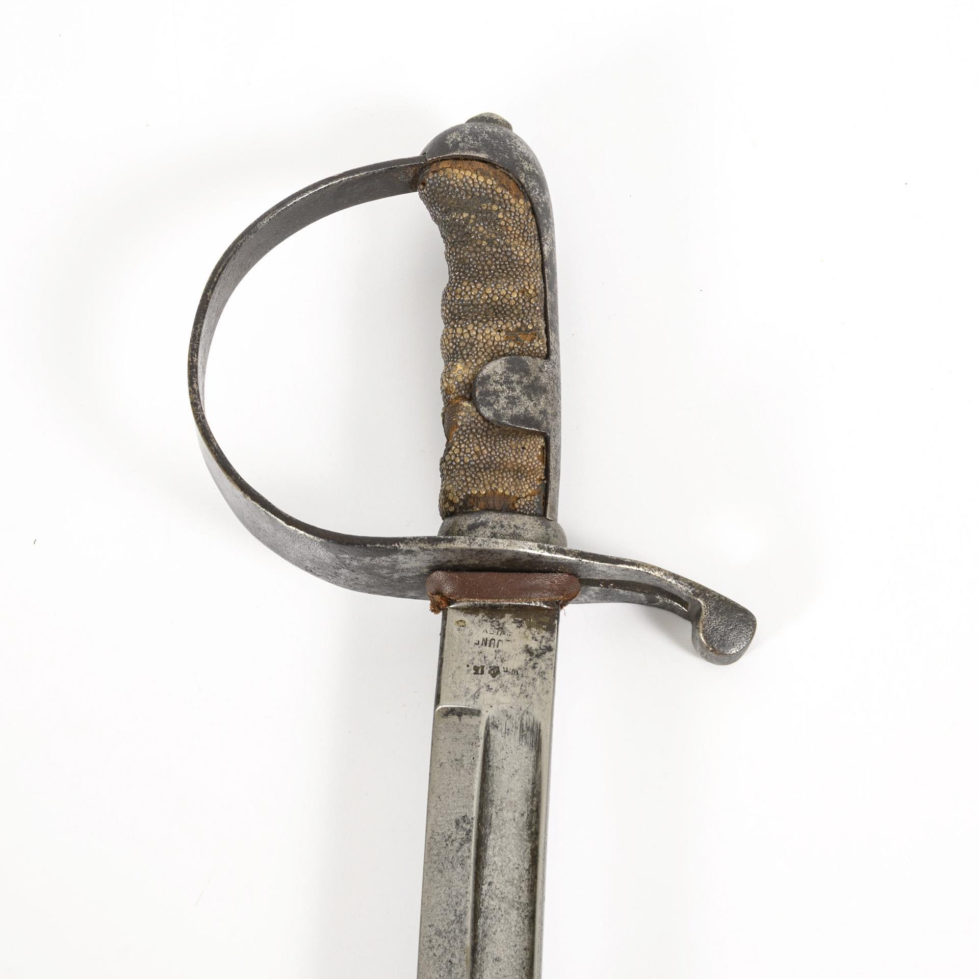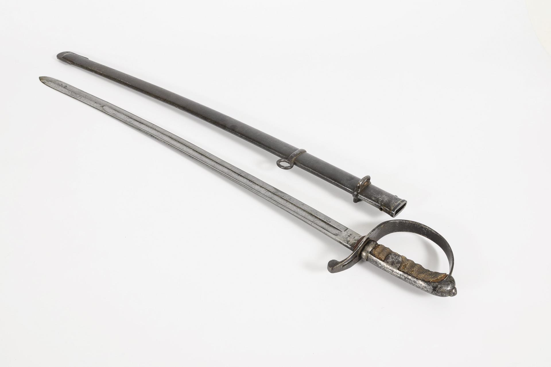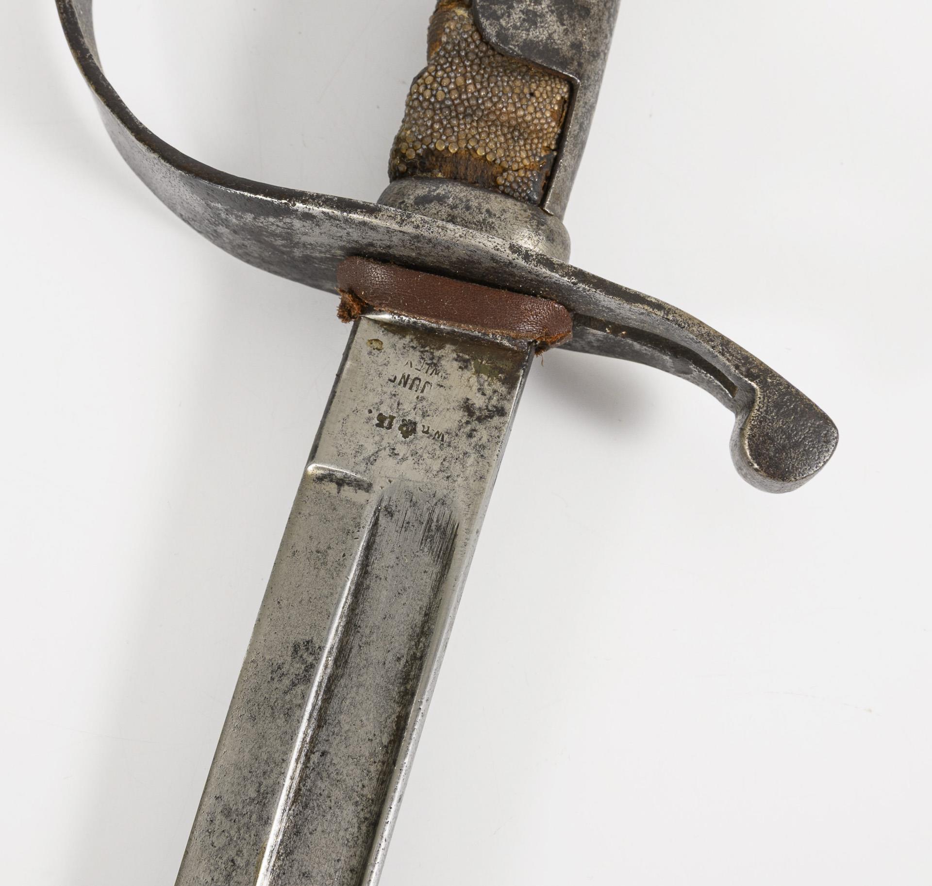 Simple iron knuckle-bow hilt with grip cap and flap, wooden grip with galuchat cover, fullered blade on both sides. Iron scabbard indistinctly stamped with the no. (78?) on the locket. Traces of rust, minor flaws on the galuchat, scabbard stiff (replaced?) with a small hairline crack near the locket.