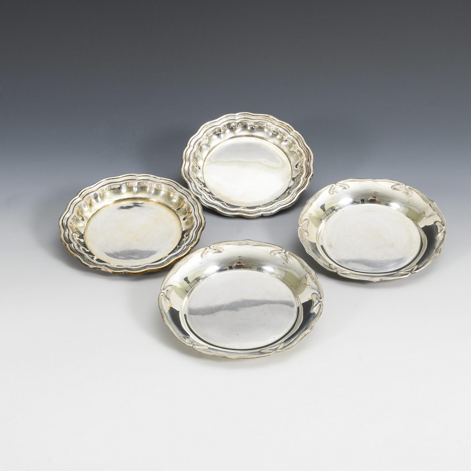 Small round plates, 2x with a curved humped rim, 2x with a grooved Art Nouveau wavy band. 1 saucer verso with date engraving "1.12.1967". Minimal signs of age and wear.