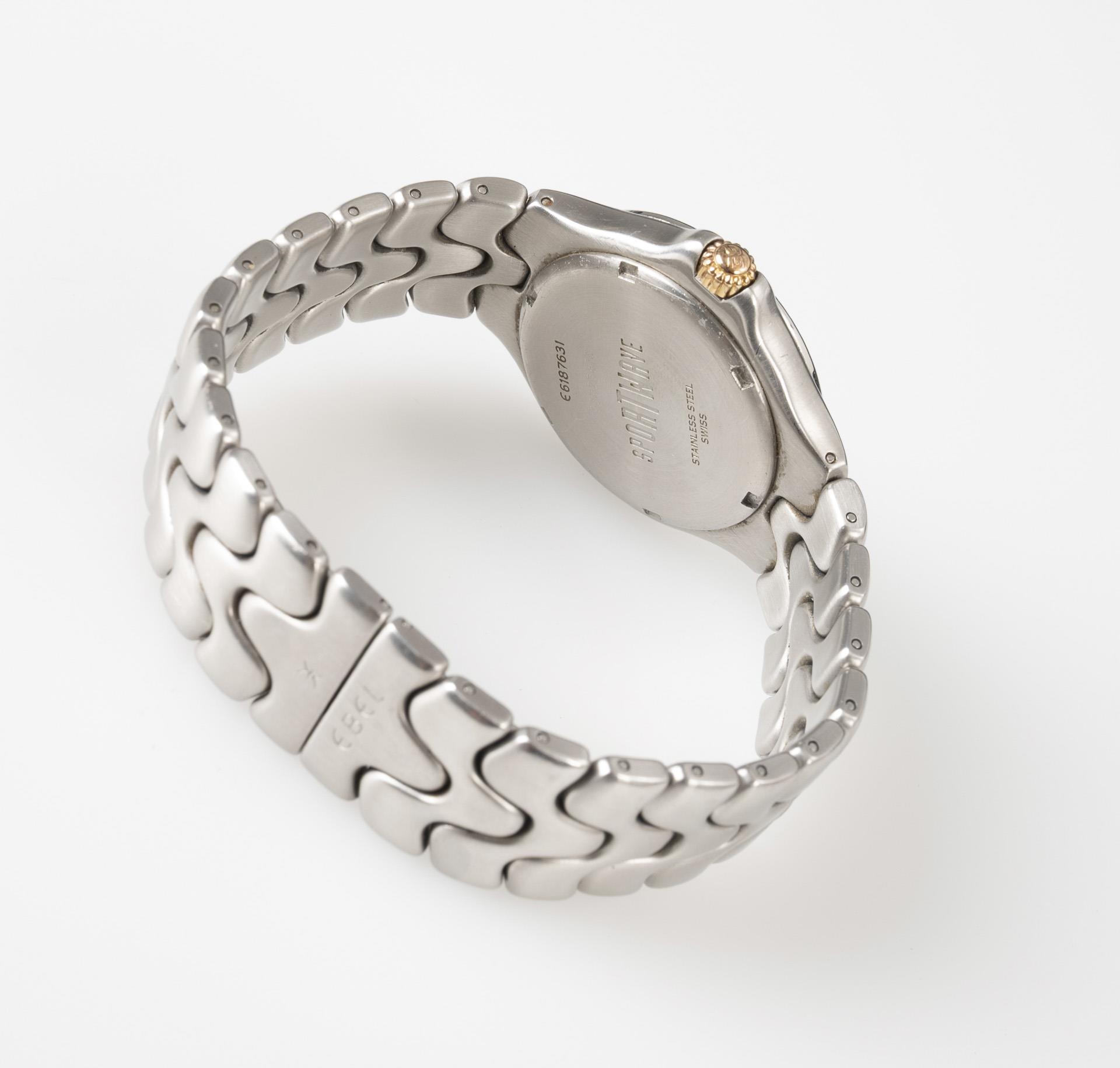 Round case with sapphire glass, bezel with gilt hour marker, screw-down back cover, on wave link bracelet with folding clasp. Scratch marks on the back.
