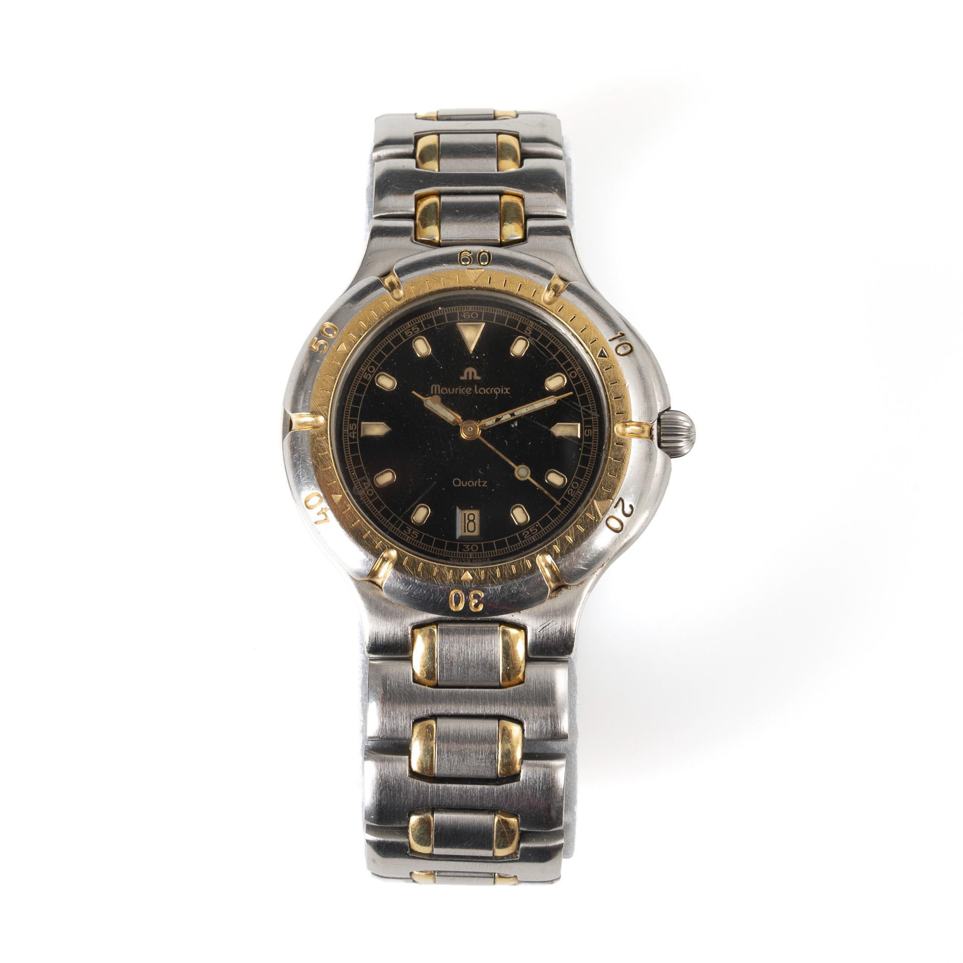 Round bicolor case and magnificent bezel with minute marker, on a black link bracelet with clip clasp. Glass and case with slight signs of wear and scratches, fluorescence slightly faded.