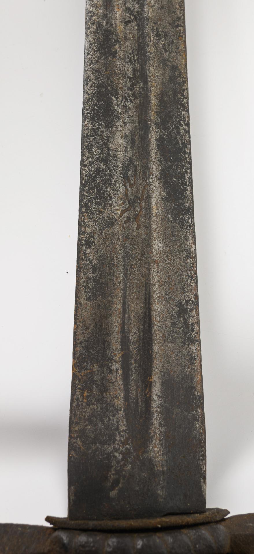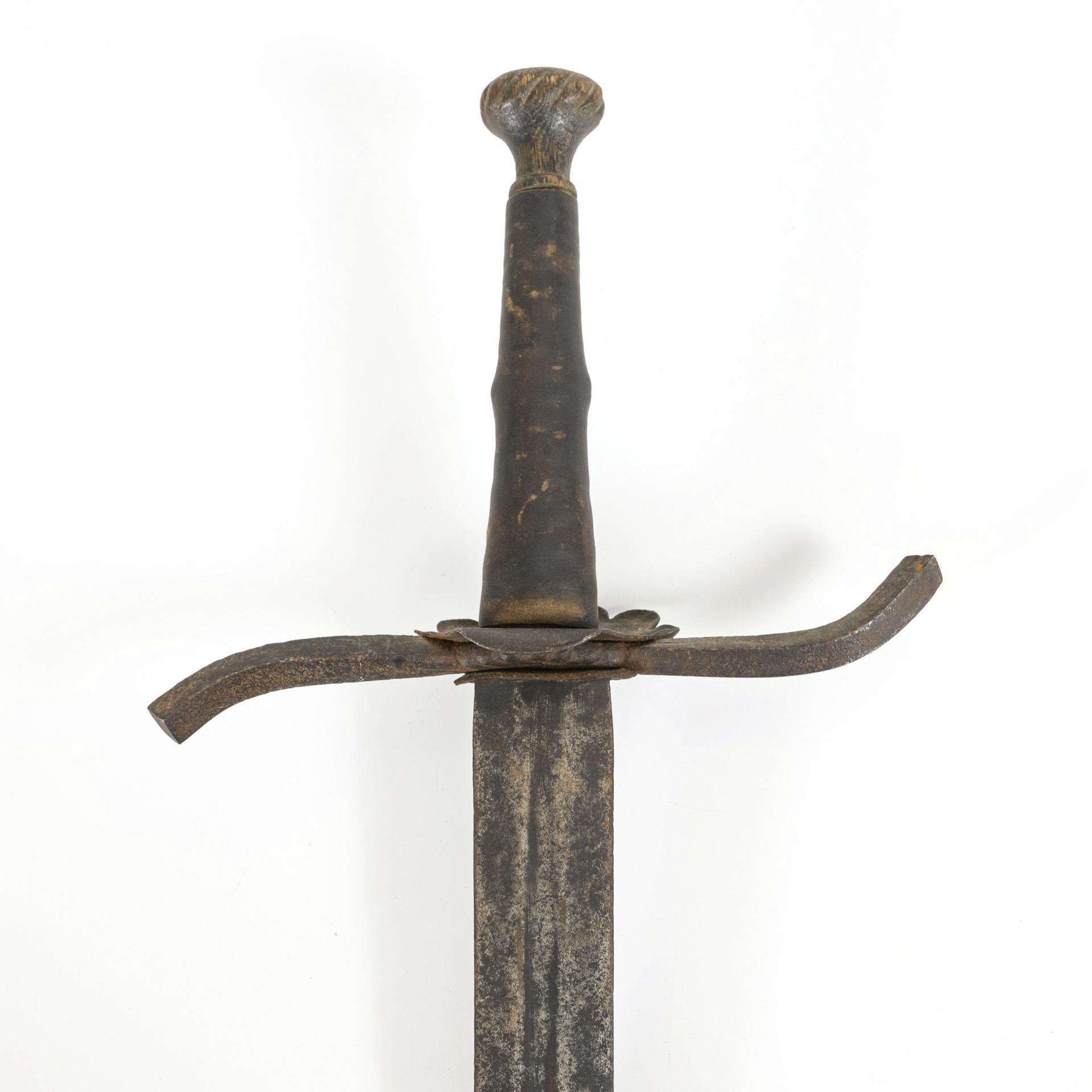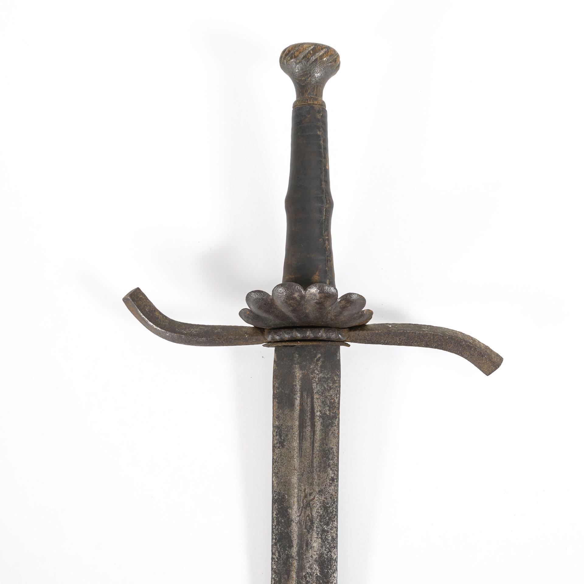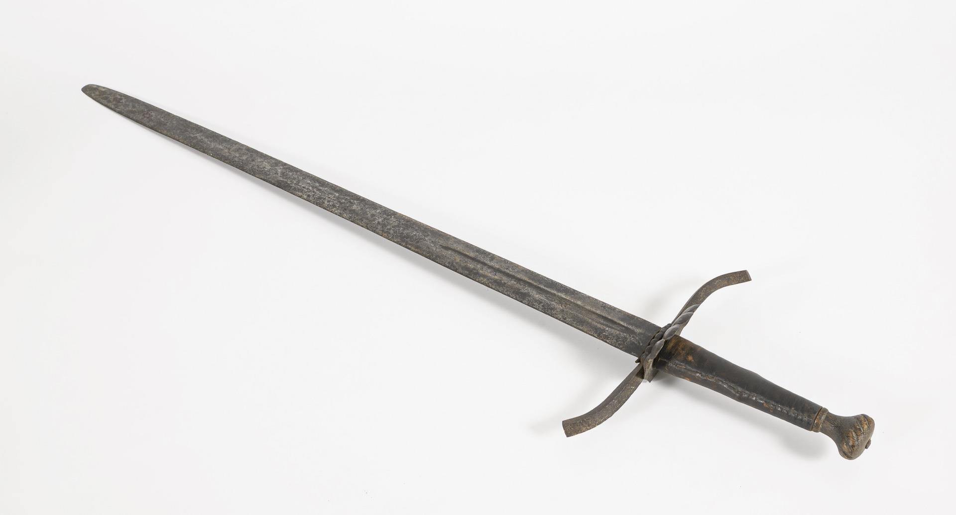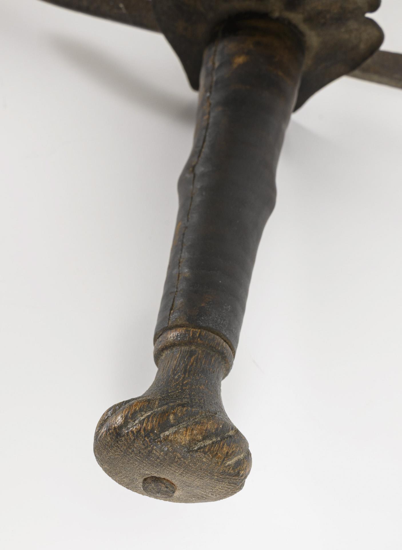 Leather-covered wooden grip with gadrooned pommel, shell-shaped guard, slightly curved quatrefoil, curved quillons, partly fullered blade. Traces of rust, especially on the blade.