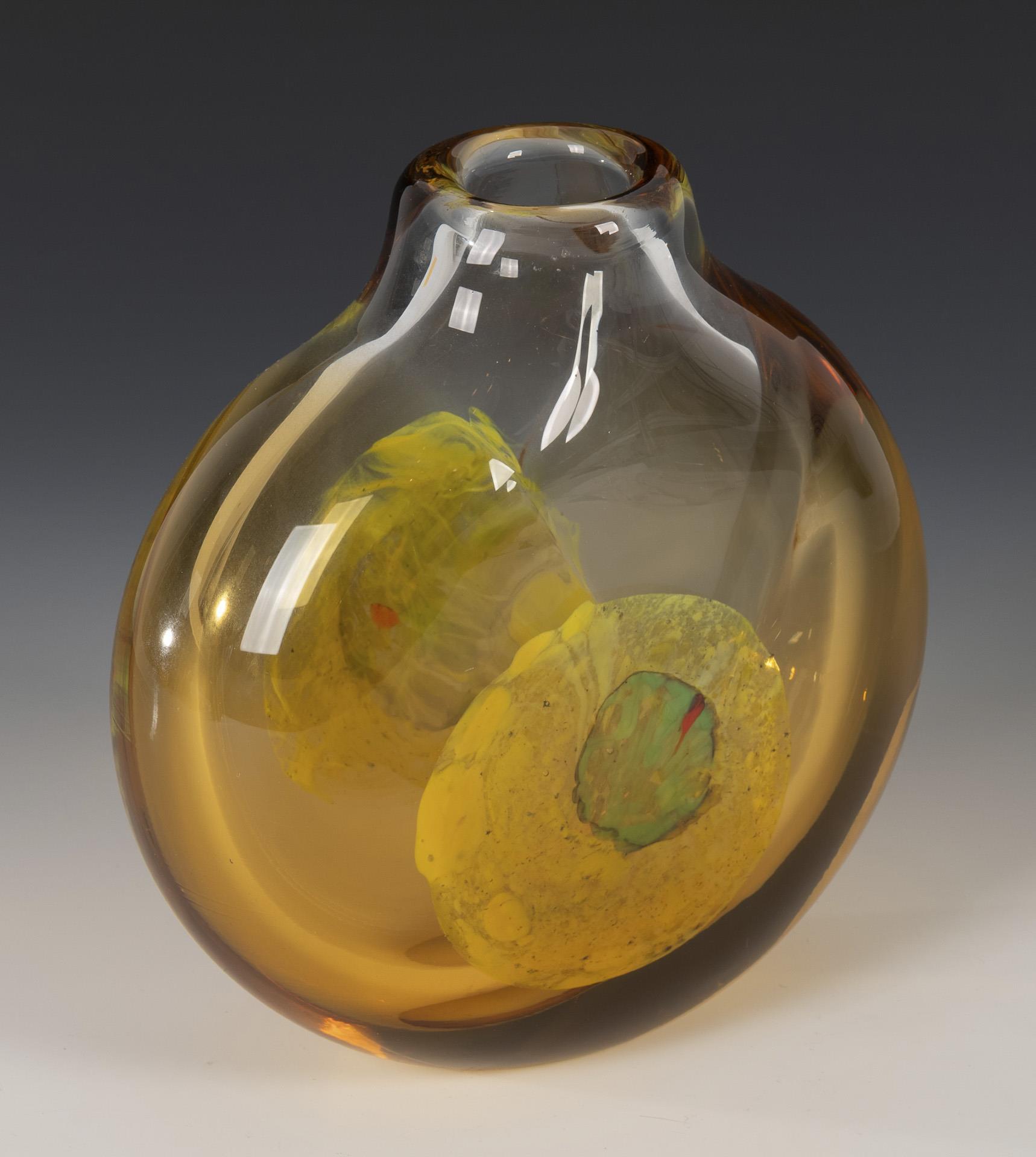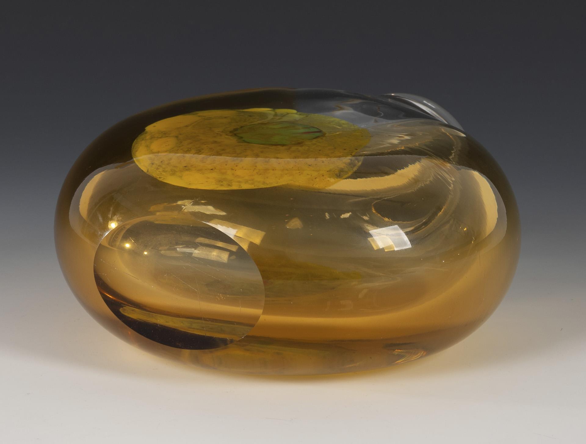 Colourless, solid glass with transparent yellow overlay and crumbled glass foils in yellow and green fused on both sides. H 20.5 cm.