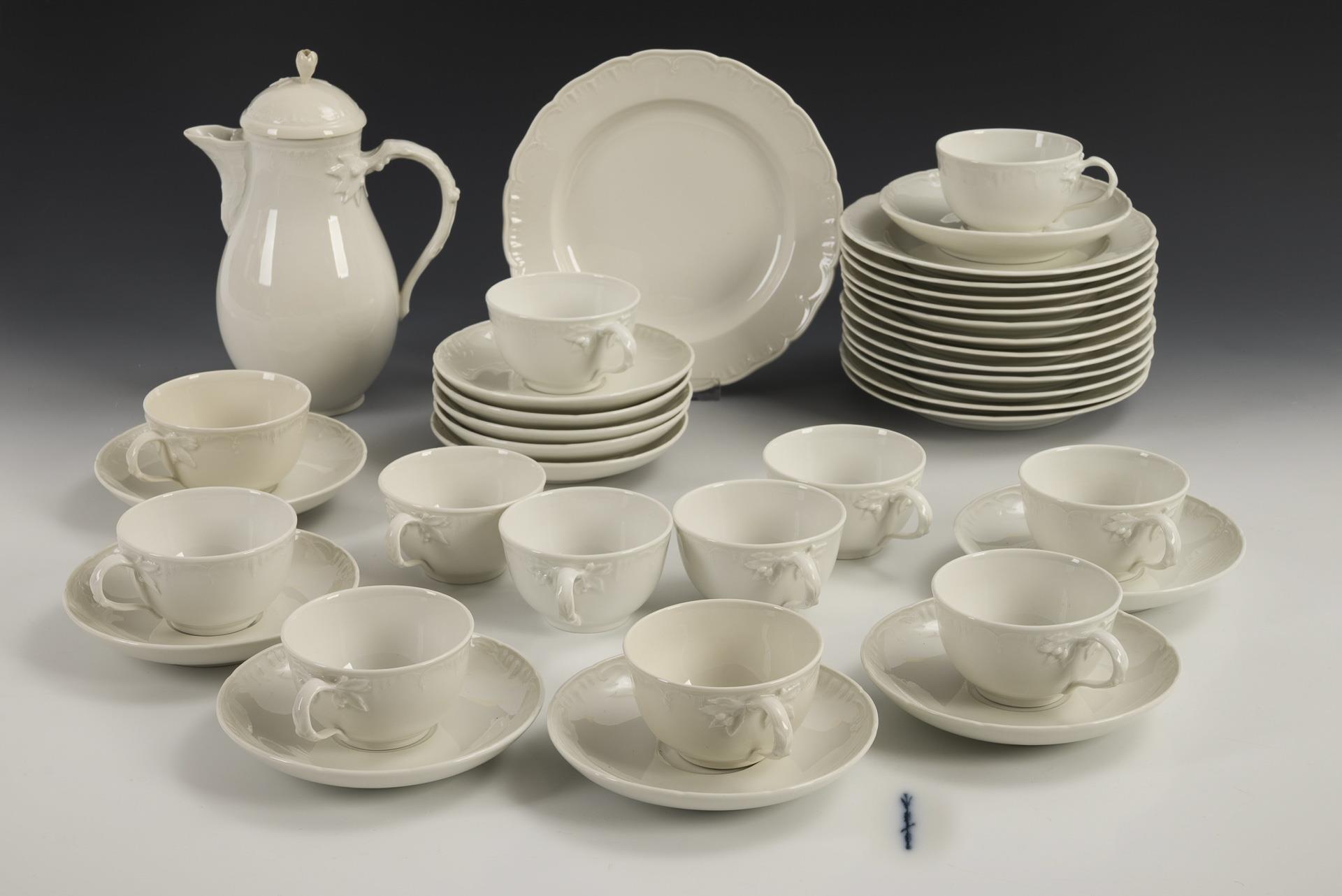 Model "Neuglatt". Coffee pot (H 22.5 cm), 12 cups (H 5.5 cm) with 12 saucers, 12 breakfast plates and 1 starter plate. Lid knob glued, hairline crack in 1 cup handle.