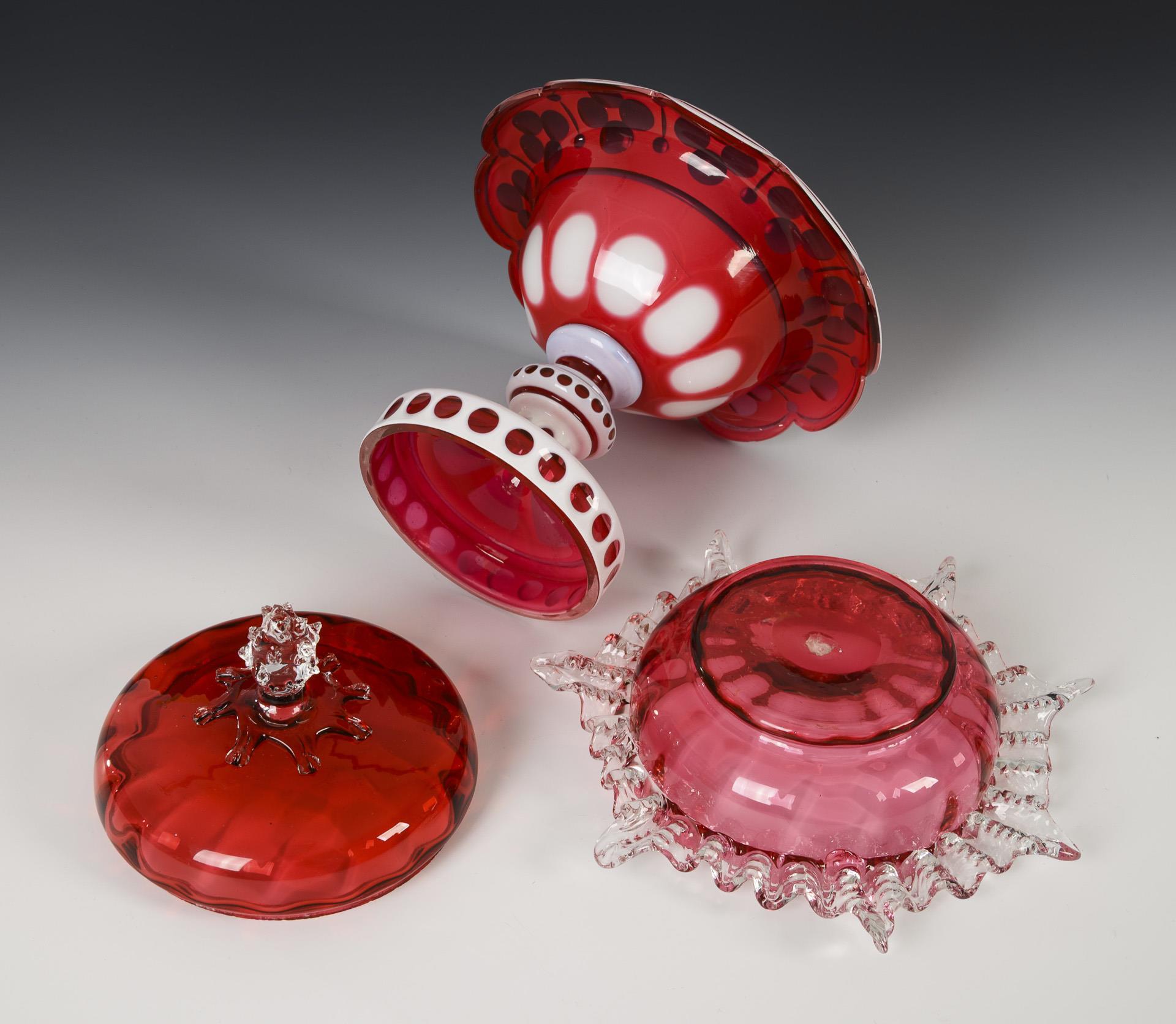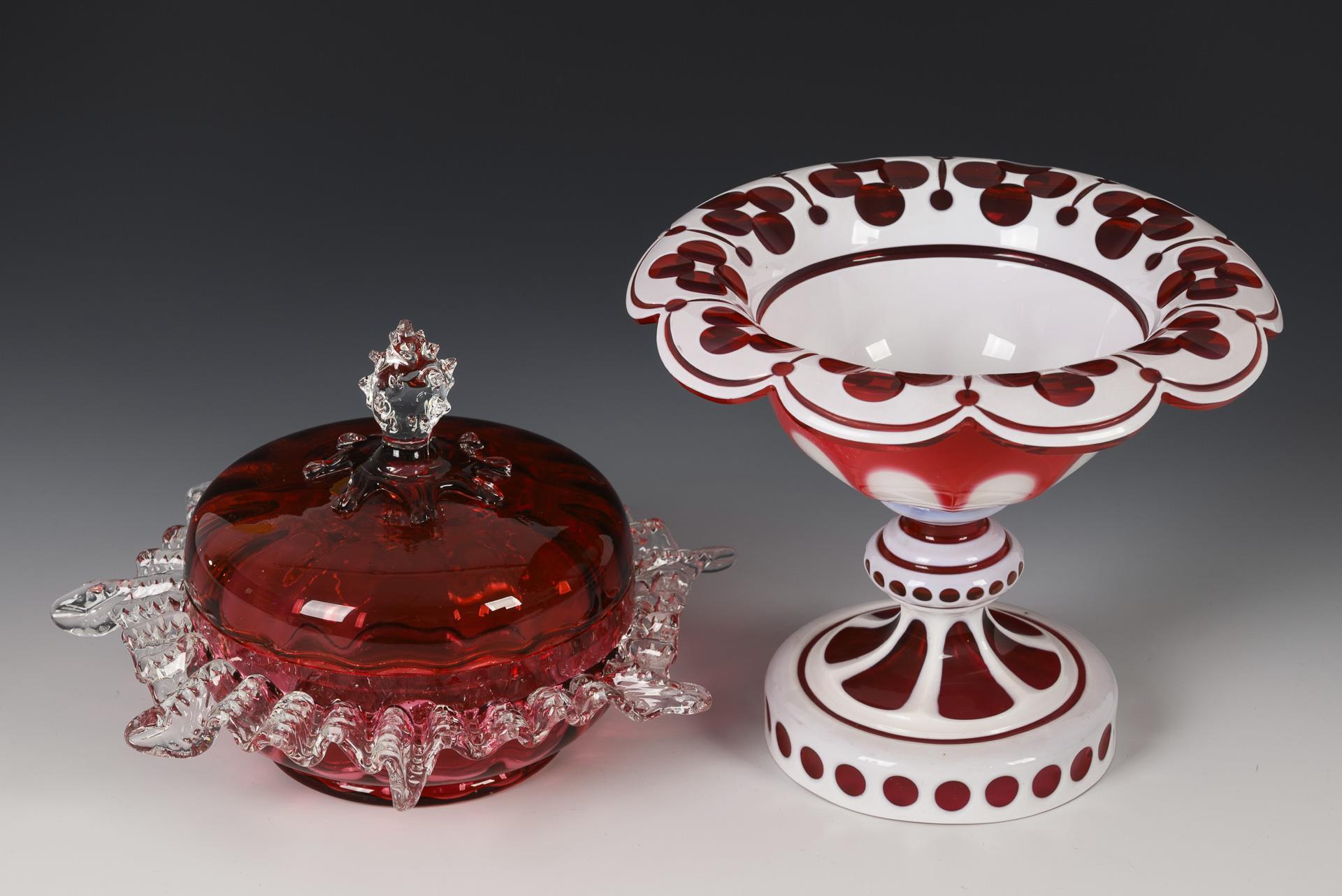 1x centerpiece made of clear glass with pewter enamel overlay and rosaline underlay: bowl with wide, ten-pass rim, on a nodded shaft, hollow foot; with lentil, notch and facet cut. / 1x pressed, bulging, longitudinally optically blown box of colorless glass with pink underlay, with a wavy, pinched rim of colorless glass fused to the body and a lid knob of colorless glass with small nubs. 3 minimal chips to the rim of the centerpiece, chips to the rim of the lid and box.