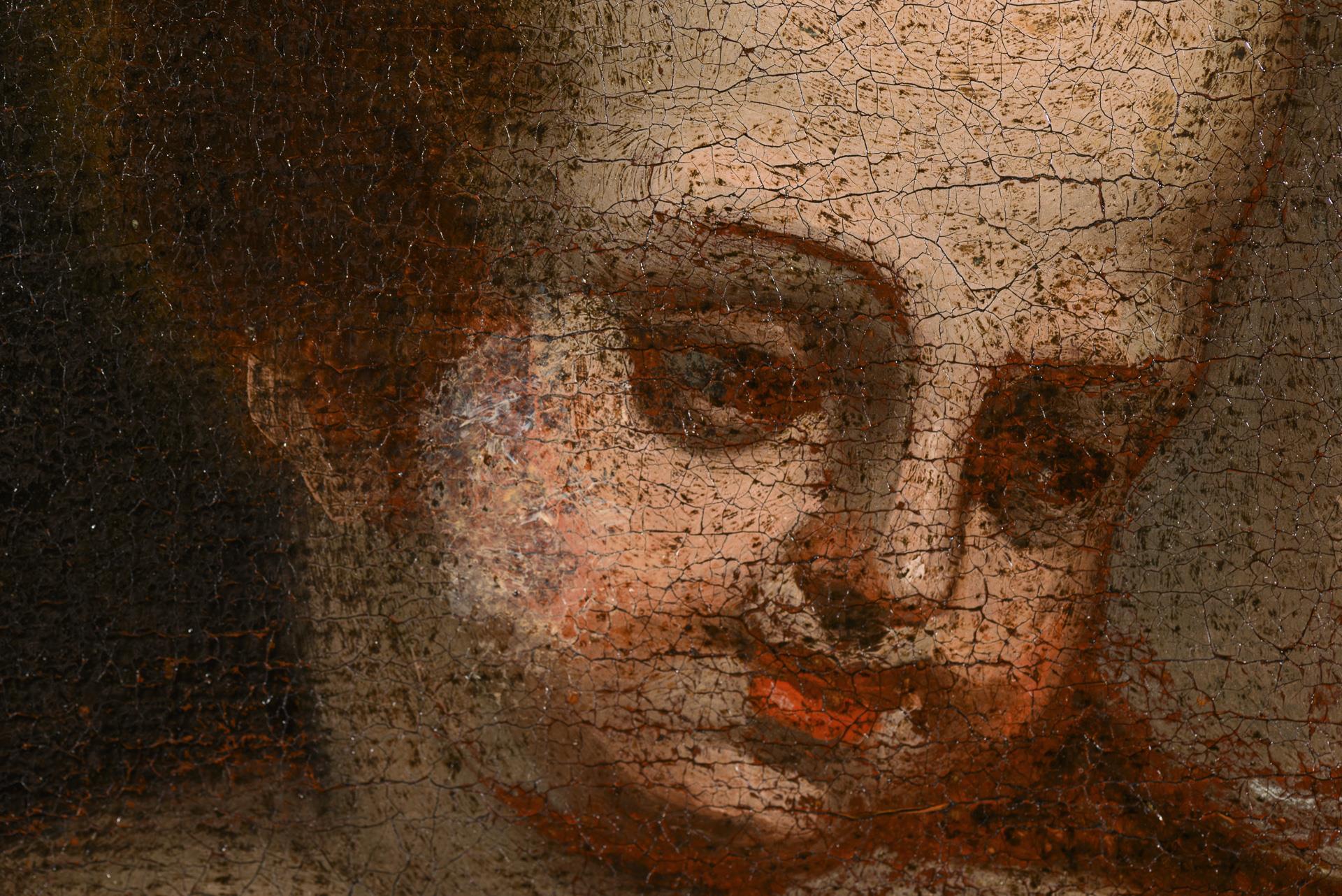 Mary with the Infant Jesus handing a lily to a young person. Traces of age.