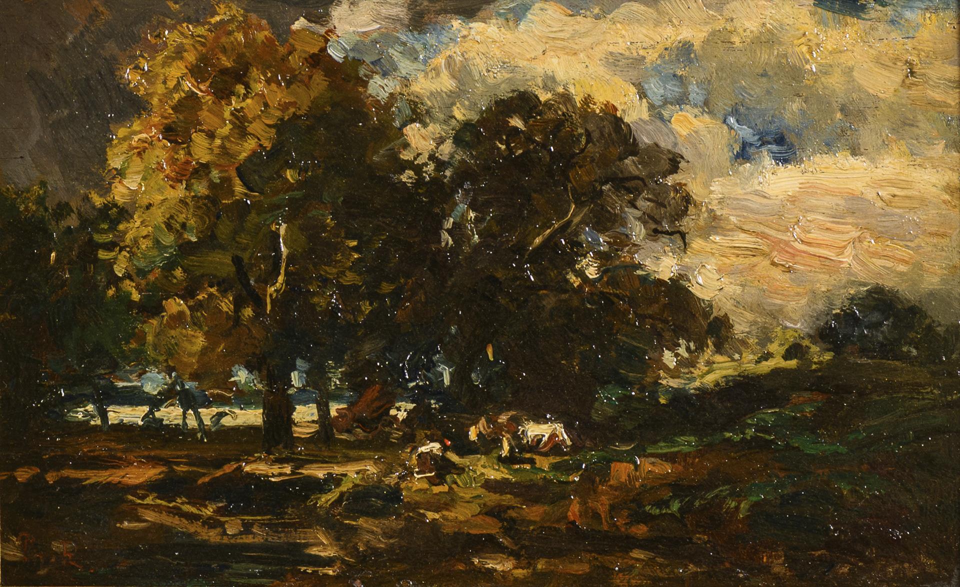Impressionistically painted landscape with animals under trees and cloudy sky near a river. Minimal traces of age.