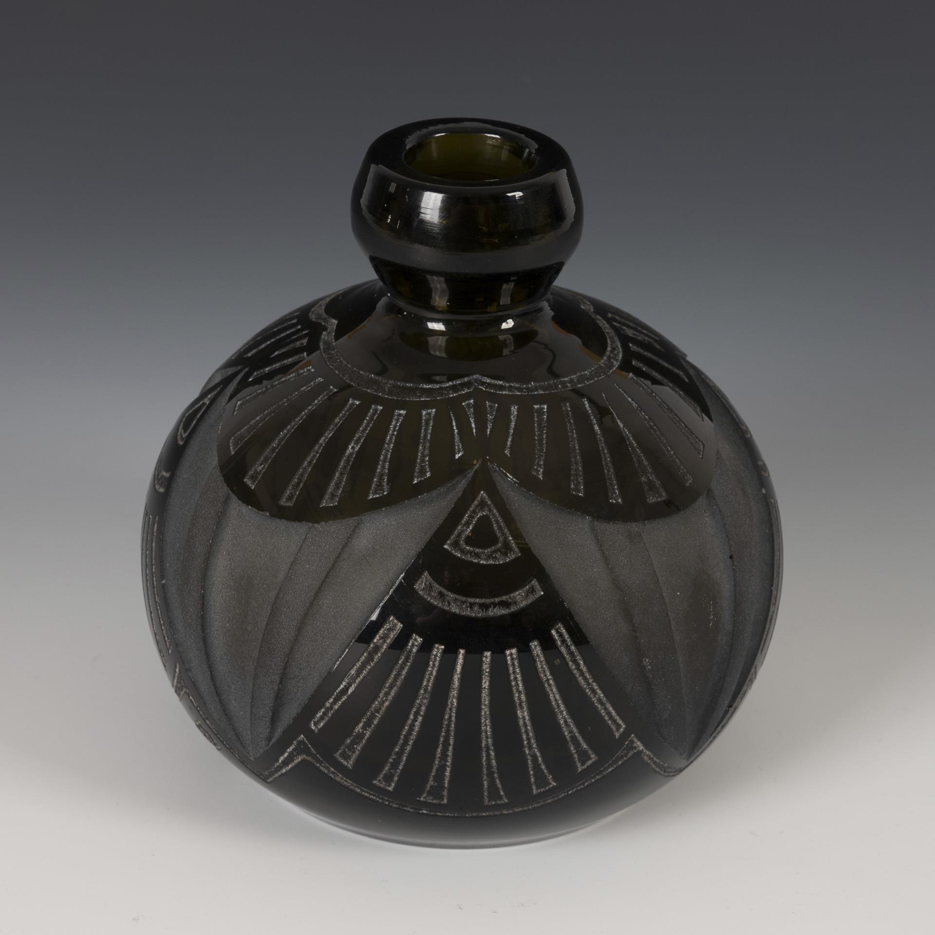Spherical vase with a flat cut stand and slightly flared neck. Deeply etched, fourfold repeating geometric decoration.