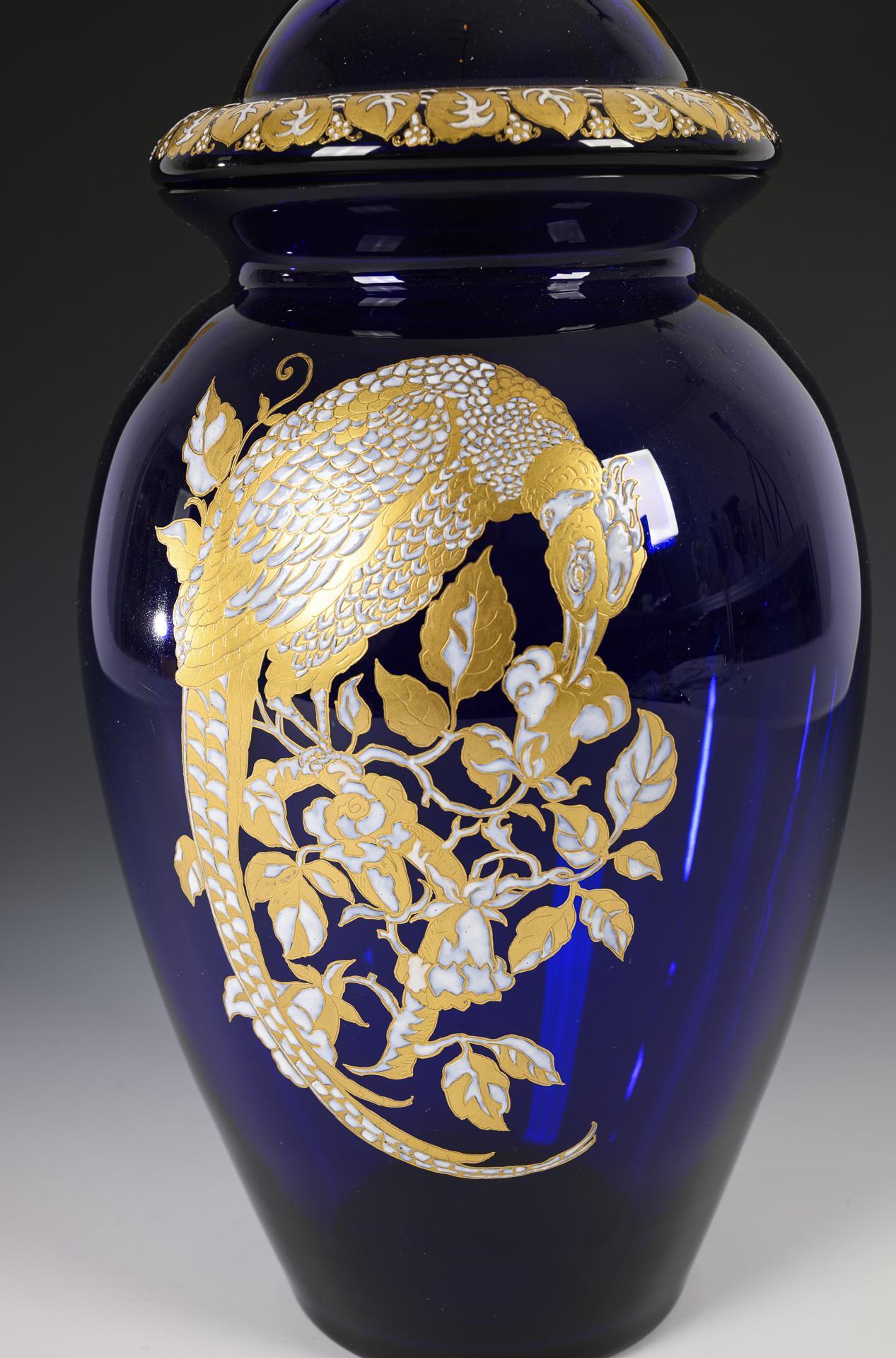 Baluster vase with ball finial lid. On the front the gold and white enamel painted, needle-etched motif of a pheasant sitting on a branch, corresponding leaf frieze on the edge of the lid. 2 chips on the inner edge of the lid.