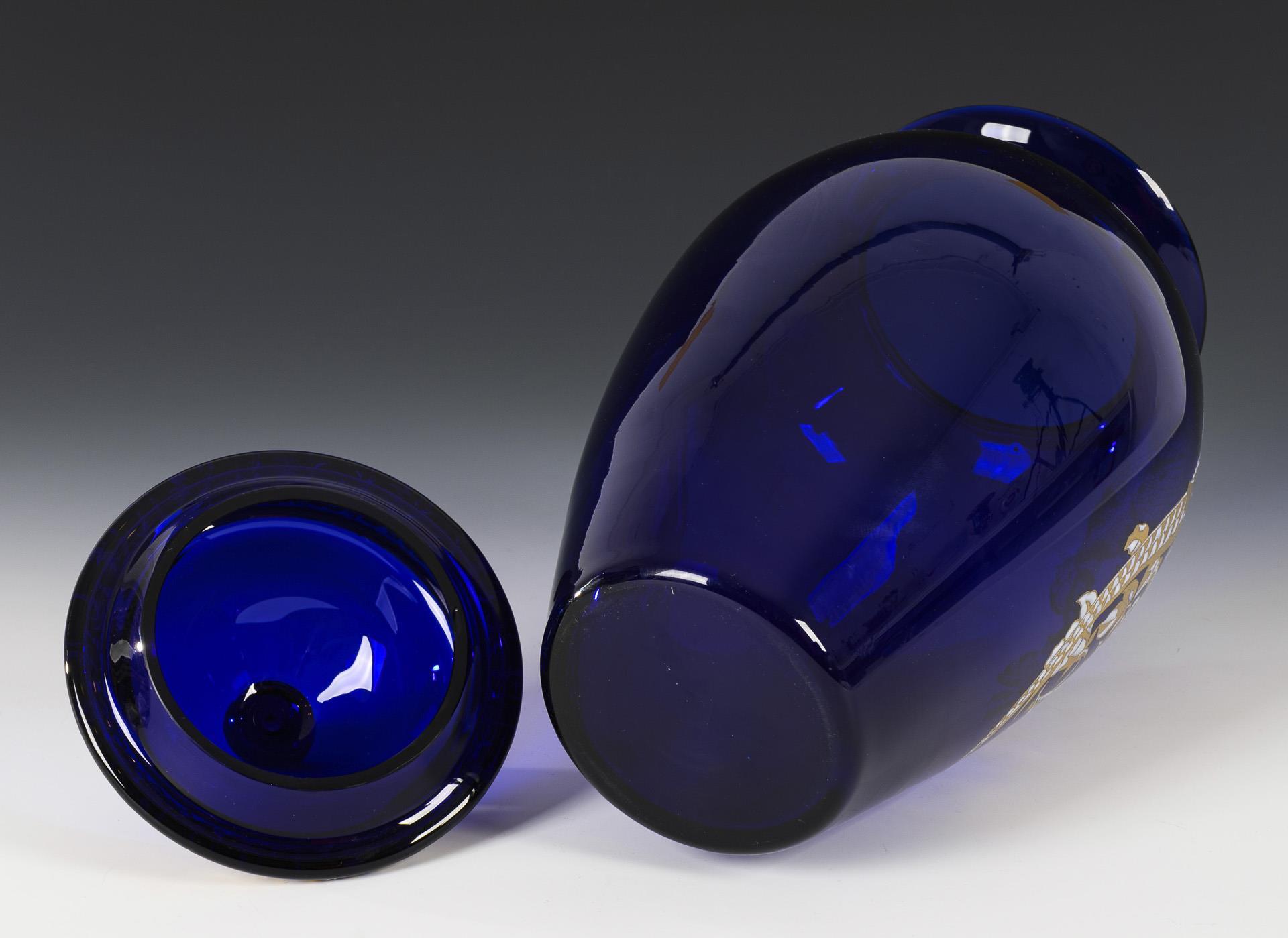 Cobalt glass, white enamel, gold decoration. H 33 cm.
