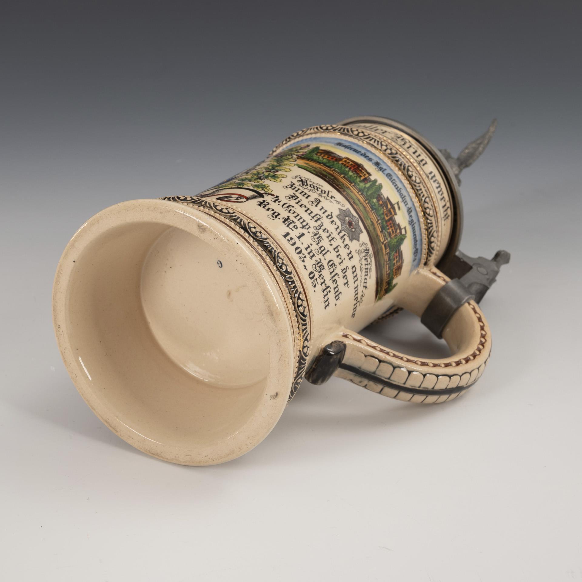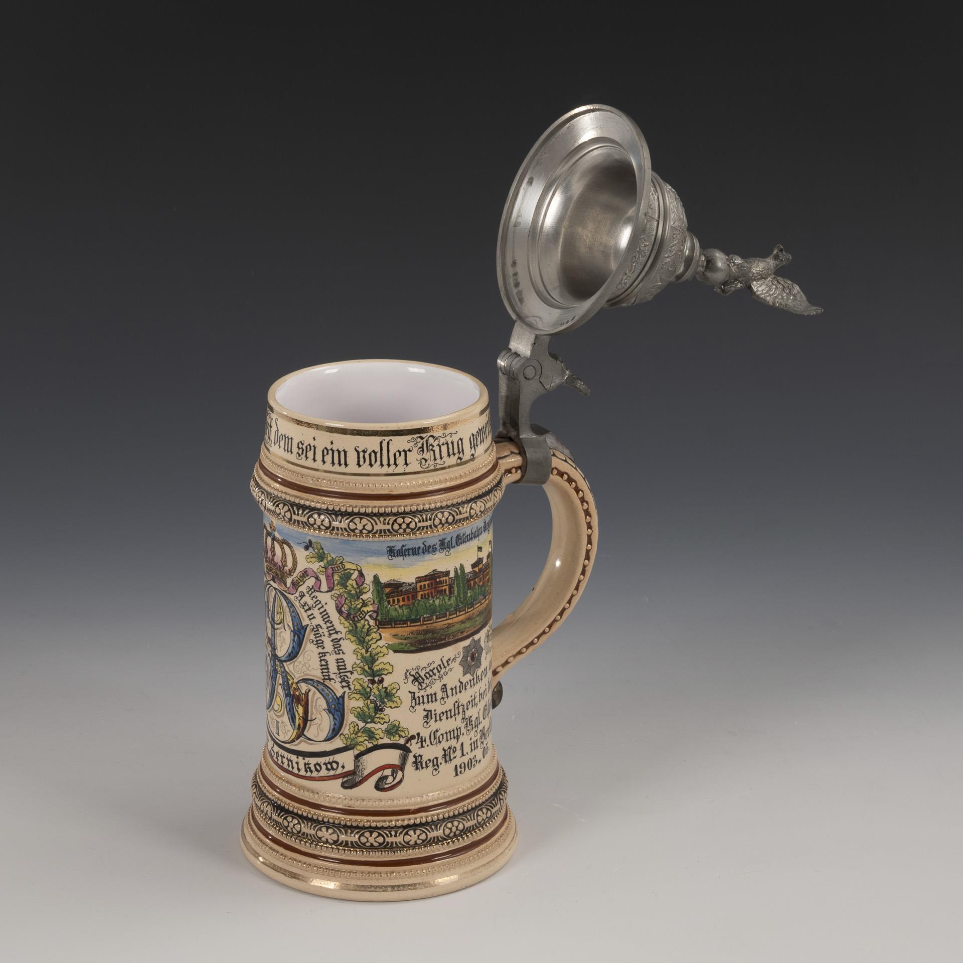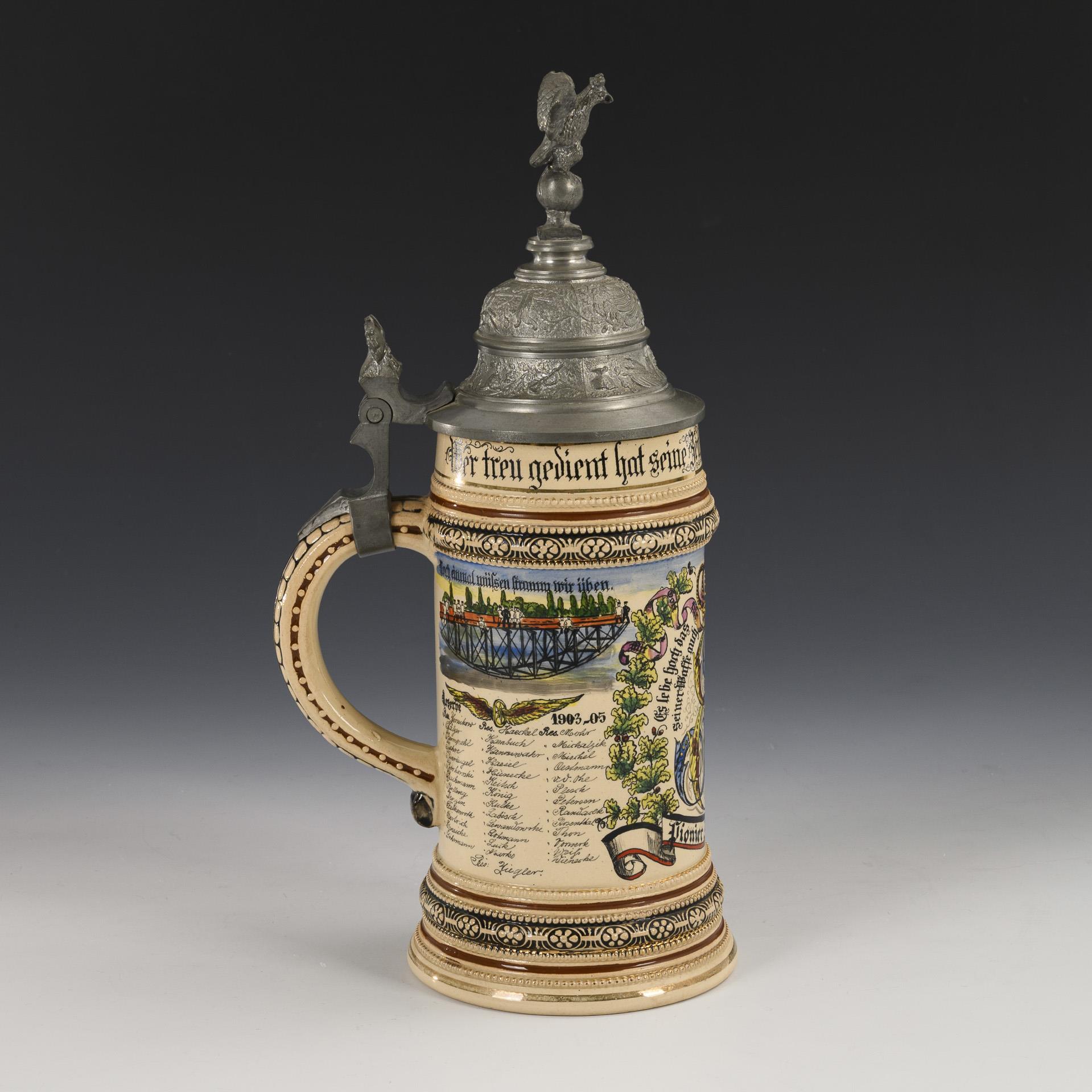 Central monogram "ER I." under the imperial crown, flanked by the barracks and a bridge as well as a written list of names. Pewter lid with eagle crown. "Pionier Zernikow, 4th Comp. Kgl. Eisenb. Reg. No 1, Berlin, 1903-1905". Pusher broken off.
