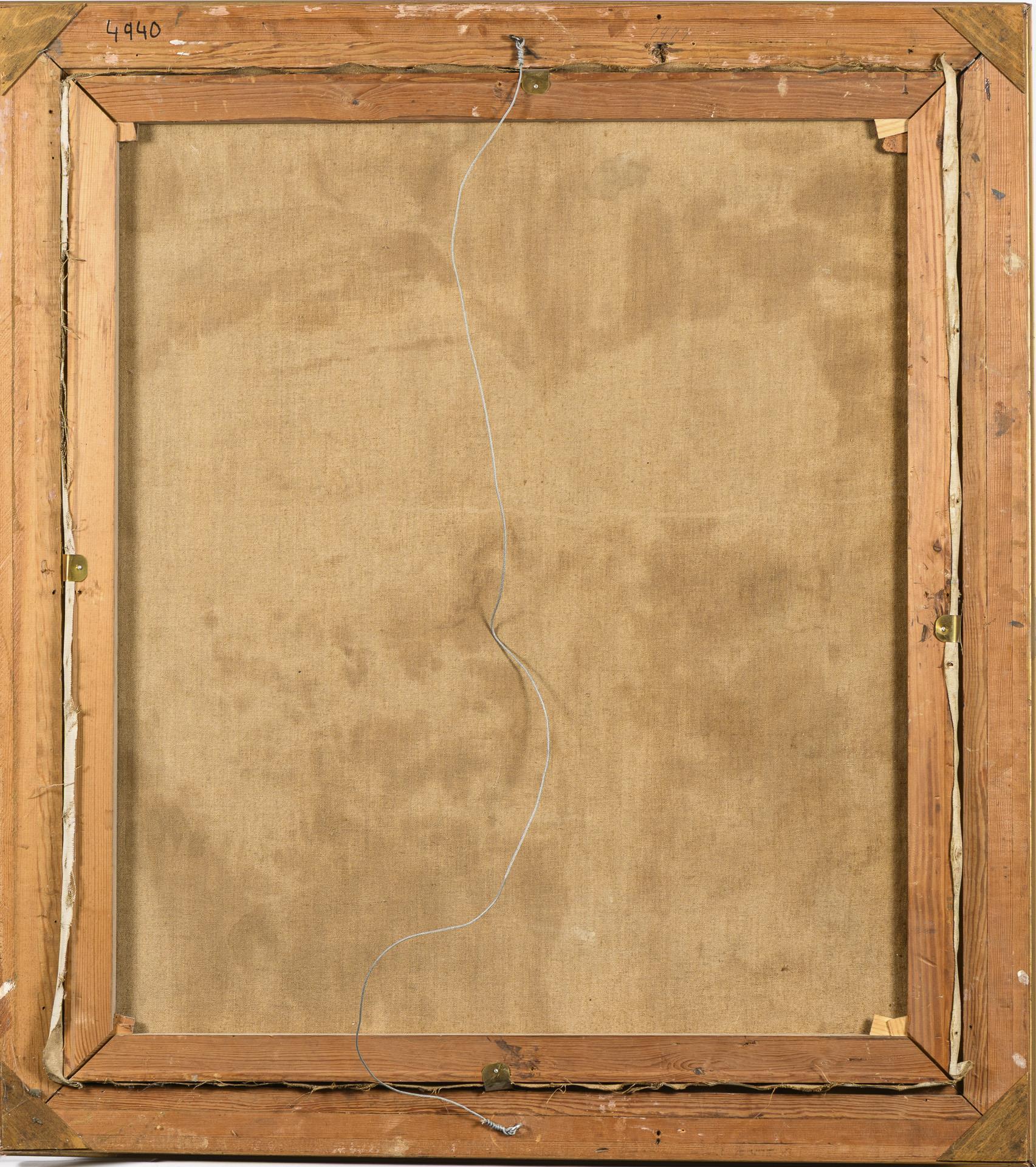 84.5 x 95.5 cm. Framed : 100 x 111 cm (gold stucco frame).