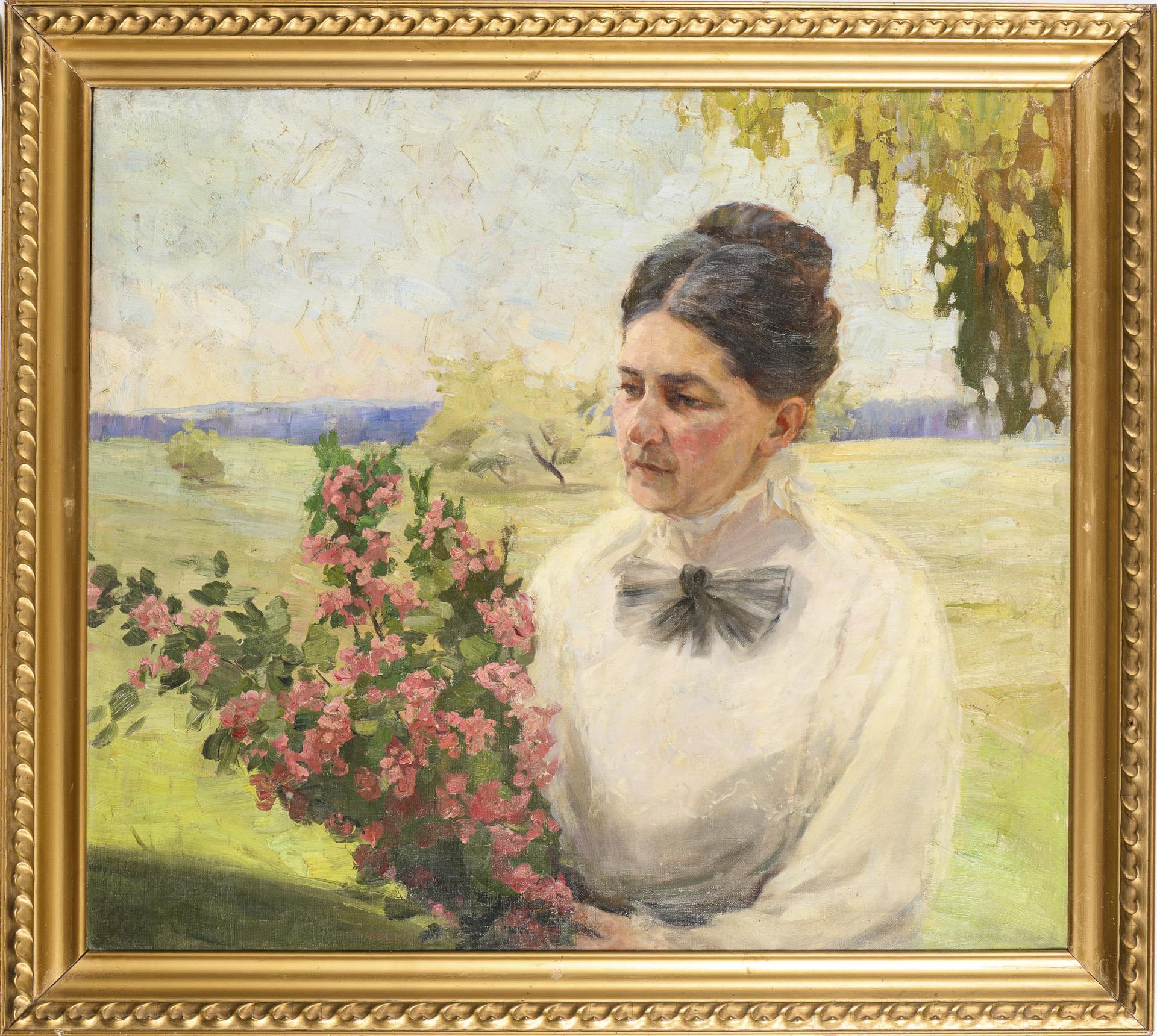 Depiction of a woman in a white blouse and with dark hair in front of a green landscape with a bouquet of flowers in her hands.