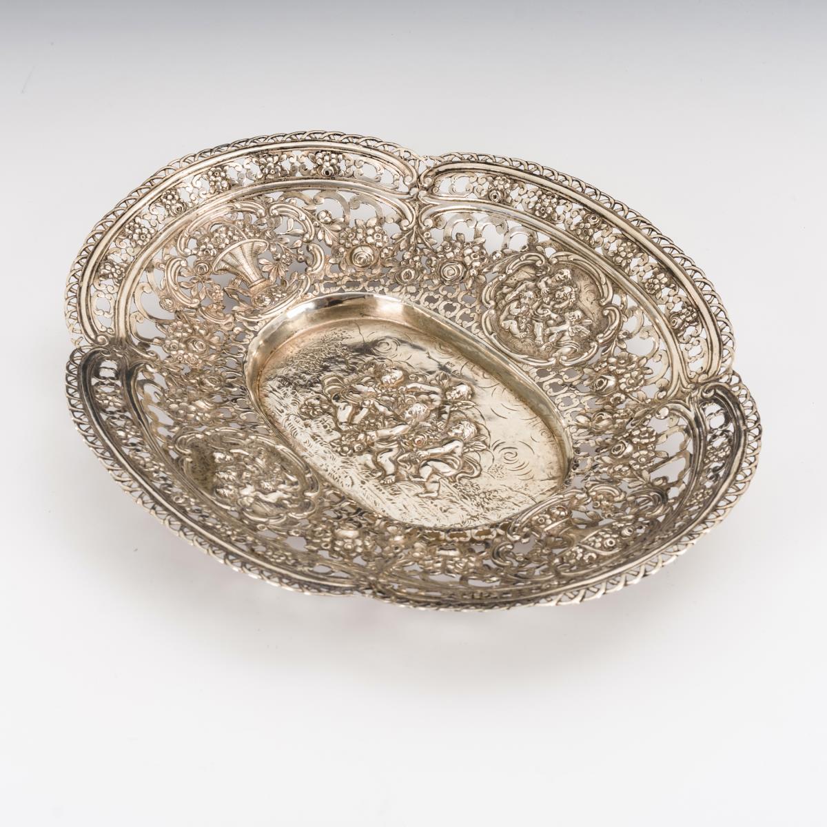 800/Halbmond/Krone gepunzt. Um 1900-20. Deutschland. Silber. 4 x 28 x 22 cm. 306 g. Reich reliefierte Durchbruchschale mit Putten, Blütenkörben und Rosengirlanden. Winzige Bruch- und Lötstellen..