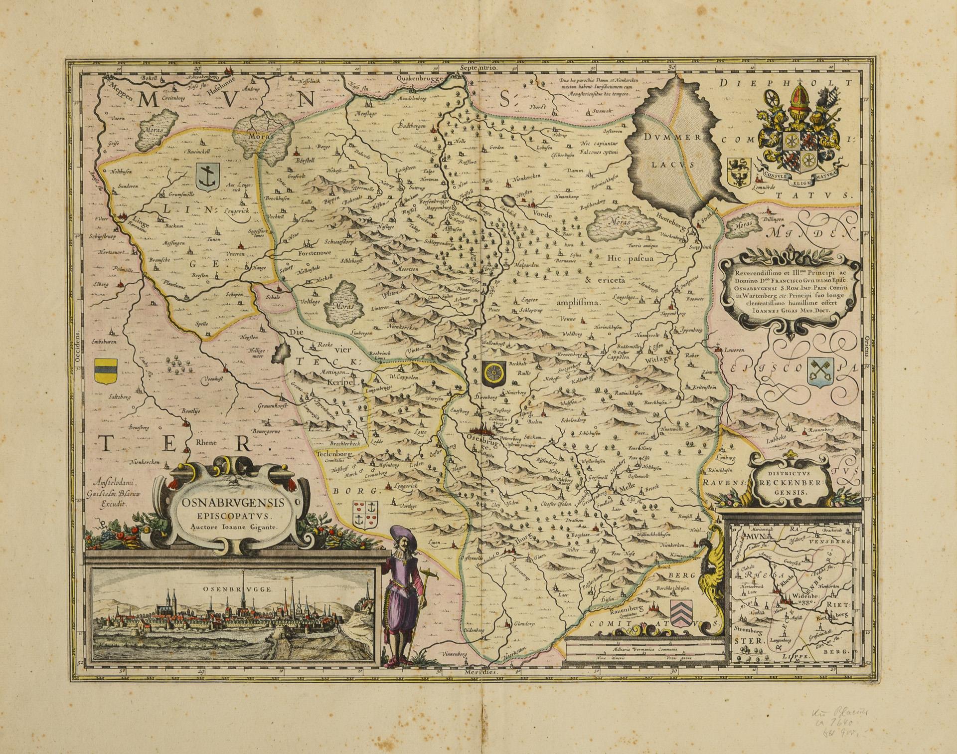 Cartouche "Osnabrugensis episcopatus Auctore Ioanne Gigante" with view of the city. Traces of age.