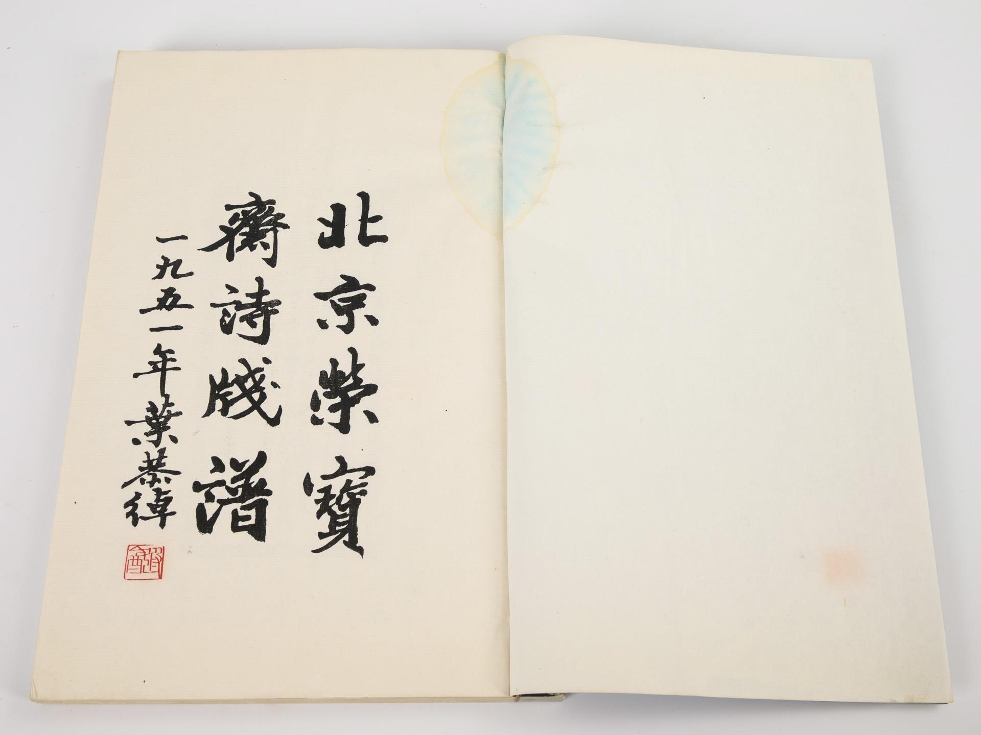 Or also "Beijing Rongbaozhai poetry Paper Collection". Here probably one volume of several. 60 woodblock prints by various artists, such as Qi Baishi, Wu Daiqiuzuo, Wang Shizi, mainly depictions of plants, birds and fruits. Preface by Zhen Zhenfeng. Minor water damage to the binding and discoloration to the endpapers.