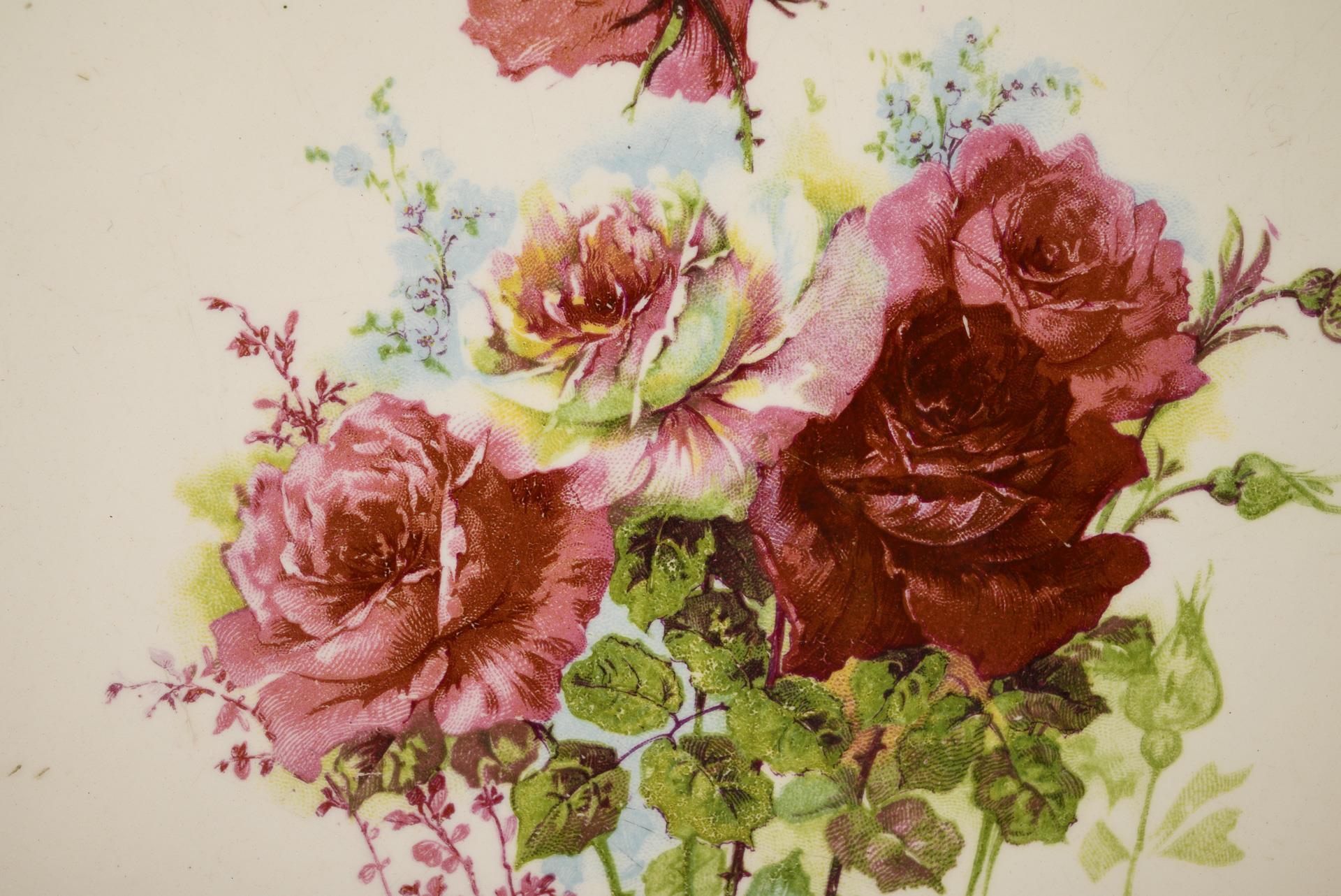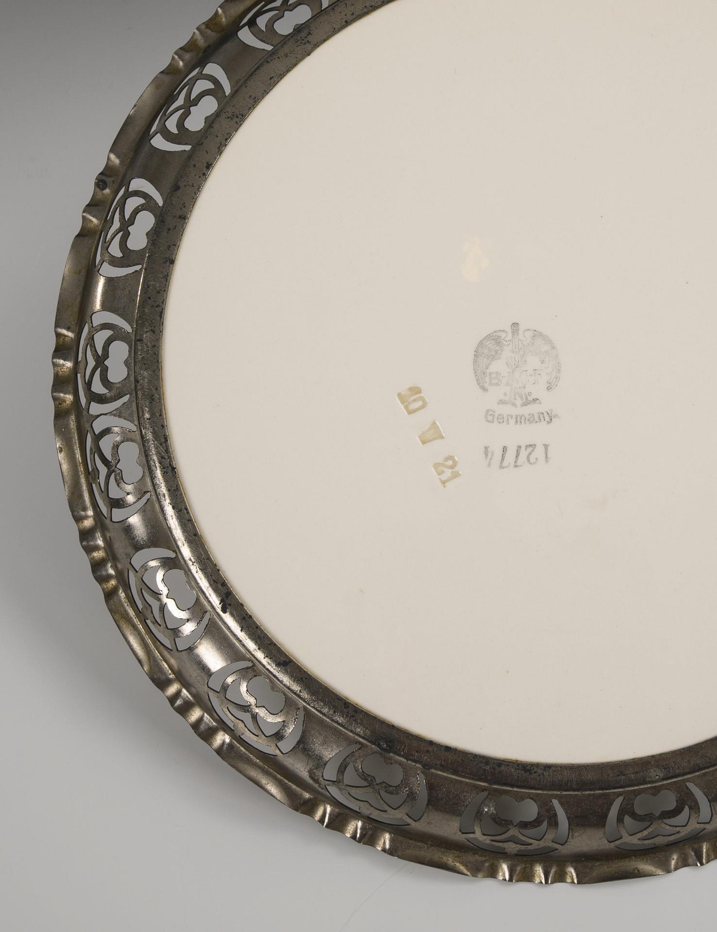 Art Nouveau cake plate with rose decoration and metal mounting. Bayrische Metallwarenfabrik GmbH Nuremberg.