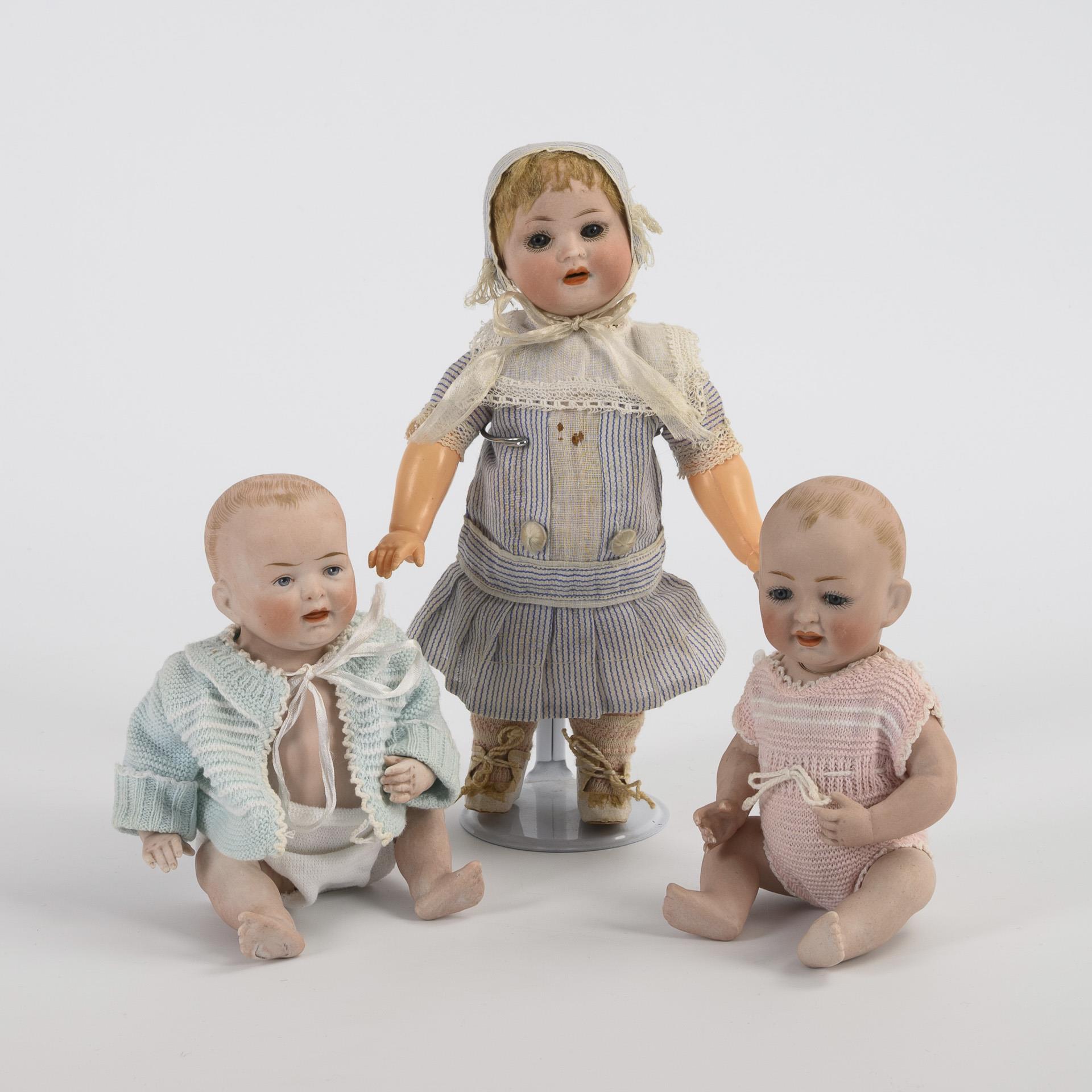 Baby with cranked head, fixed blue glass eyes and pink romper. 1 finger minimally bumped. L 19 cm. / Baby with fixed head, painted blue eyes and light blue jacket. L 20 cm / Blonde girl (porcelain factory Mengersgereuth) with crank head, blue sleeping eyes, mohair wig, mass body with celluloid arms and sailor dress. L 25 cm.