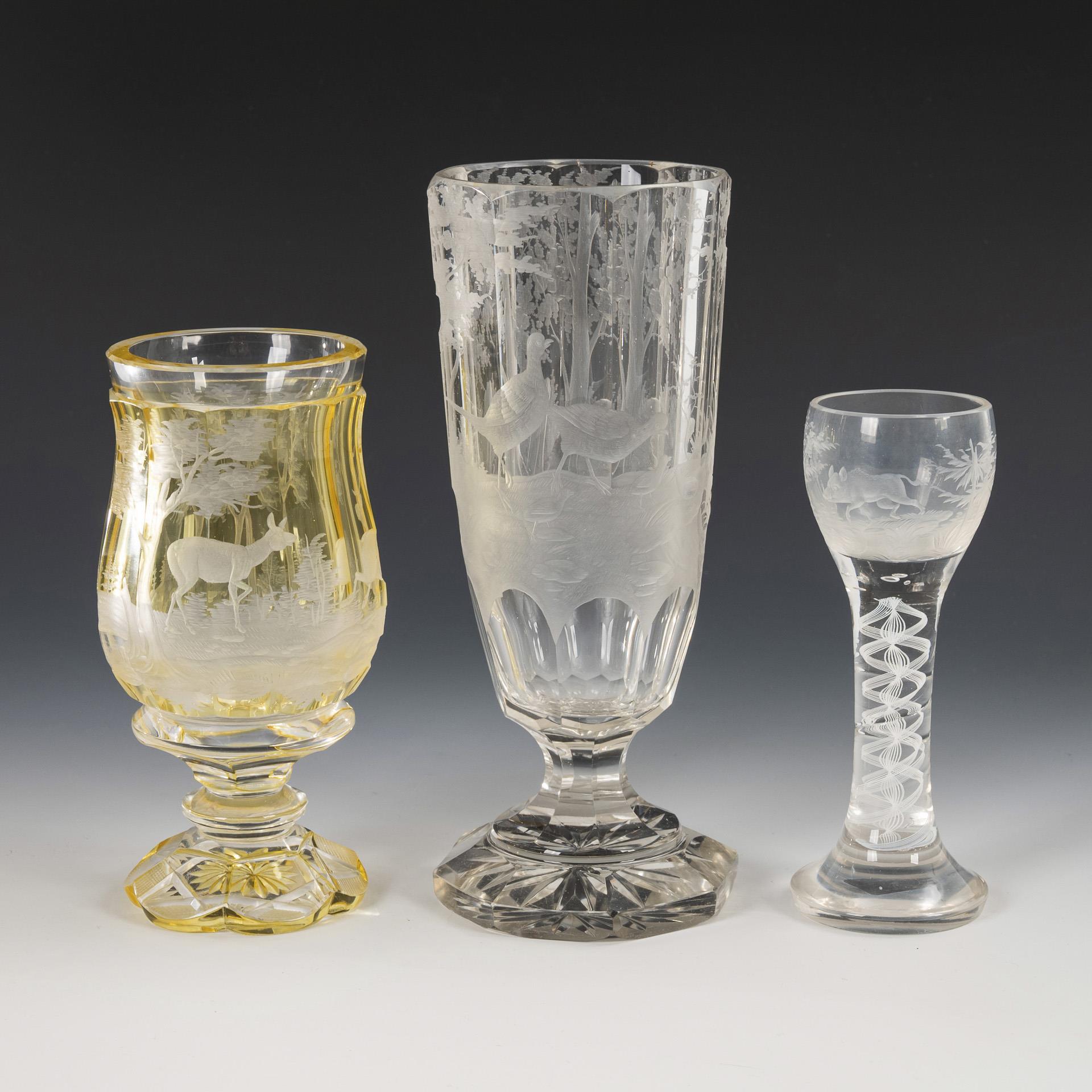 BÖHMEN, 19th century.: 1x eight-facetted goblet with short stem and octagonal foot: all around a cut forest landscape with a pair of pheasants and pheasant chicks (H 21 cm); 1x faceted bell goblet made of colorless glass with yellow overlay, nodded, short stem, six-pass foot with notched decoration on the bottom: all around a cut forest landscape with a leaping stag (H 16 cm). / 1x JOSPHINENHÜTTE, 1912-1930: Roman with bulbous dome, solid shaft with white lace filigree, round base: engraved landscape island with boar on the dome (H 14.5 cm). 1x small chips to the foot edges.