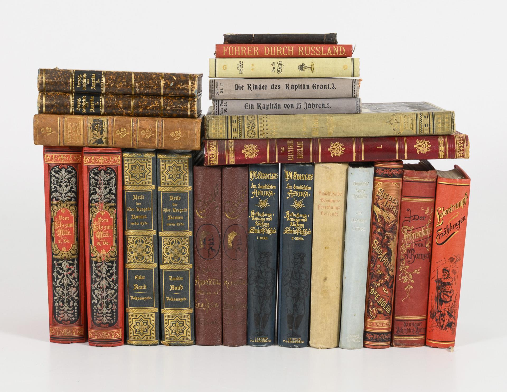 Robertson, Wilhelm. "Geschichte von Amerika", First volume, Leipzig 1777, published by Weismanns Erben und Reich, 574 pages and 2 maps. Half leather binding / Herzog: "Aus Amerika - Reisebriefe", 2 volumes, Berlin 1884, Puttkammer & Mühlbrecht (includes United States of North America as well as Cuba, Mexico and South America). / Hans Erich von Tzschirner-Tzschirne: "In die Wüste", with personal dedication by the author (a great supporter of Karl May). 268 pages, half cloth binding / Friedrich Gerstäcker: "Wie ist es denn nun eigentlich in Amerika?", Leipzig 1849, 127 pages, half leather binding / "Praktischer Reiseführer durch Russland", Leipzig 1881, published by Wolfgang Gerhard, 262 pages without railroad map. / H- Boskoschyn: "Das asiatische Russland", Leipzig, published by Greßner & Schramm, 296 pages with a large number of wood engravings, in a splendid binding with gilt edges. / Eugen Wolf: "Meine Wanderungen - Im Inneren Chinas" Part I, Stuttgart 1901, 298 pages and a map with the routes. Cloth binding with silver edges. / Gonzenbach: "Nilfahrt", Deutsche Verlagsanstalt 1890, 212 pages with many illustrations and a map, embossed cloth binding / Rudolf Zabel: "Berühmte Forschungsreisende im Verkehr mit wilden Völkern - klassische Schilderungen aus der Völkerkunde", Hansa Verlag 1910, 534 pages. / Emil Holub: " Sieben Jahre in Süd-Afrika - Erlebnisse, Forschungen und Jagden auf meinen Reisen von den Diamantenfeldern zum Zambesi (1872 - 1879)" 1st volume, Vienna 1881, 528 pages and a map, gold-stamped cloth binding / Karl von Scherzer: "Reise der Oesterreichischen Fregatte Novara um die Erde in den Jahren 1857, 1858 und 1859 unter den Befehlen des Commodore B. von Müllerstorf - Arbair, 2 volumes with gold embossing, more than 1200 pages with some plates and maps as well as numerous illustrations / Gaetano Casati: "Zehn Jahre in Äquatoria und die Rückkehr mit Emin Pascha", Bamberg 1891, 2 volumes, approx. 700 pages and an enclosed map. / Henry M. Stanley: "Im dunkelsten Afrika - Aufsuchung, Rettung und Rückzug Emin Pascha's", 2 volumes, Leipzig 1890, approx. 1000 pages and maps. / 2 volumes "Vom Fels zum Meer", Volumes 7 and 8, April 1885 to October 1887 / Adolar Borneck. "Der Fährtensucher", Stuttgart, published by Schmidt & Spring, 620 pages. / Hummel: "Lederstrumpf-Erzählungen - Bilder und Szenen aus dem fernen Westen", Leipzig, 810 pages. / Jules Verne: "Ein Kapitän von 15 Jahren" and "Die Kinder des Kapitän Grant", Verlag A. Weichert, both in cloth binding. A total of 23 books. All with signs of age-appropriate wear.