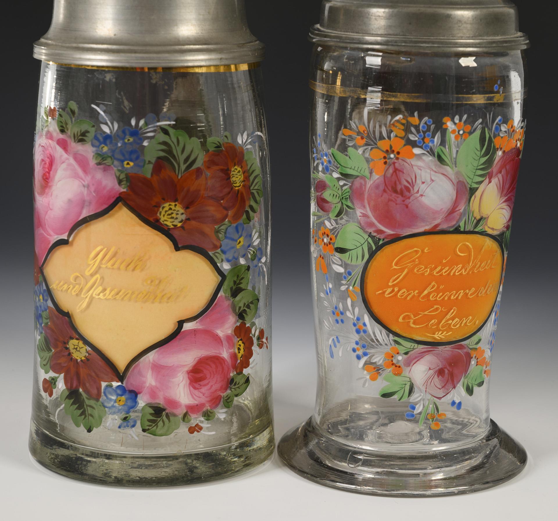 1x Saxony, around 1840: slightly conical jug with flared stand and engraved "C. G. S. 1841" on the pewter lid. On the front a bouquet of flowers with an orange backed medallion with the wish "Gesundheit verlänre dein Leben.". / 1x 19th century: conical jug with a porcelain plaque in a pewter-mounted hinged lid. On the front a bouquet of flowers with the wish "Glück und Gesundheit" in a quatrefoil cartouche, on the porcelain plaque a crucifixion depiction. 1x stress crack in the handle, 1x stress crack at the bottom of the handle.