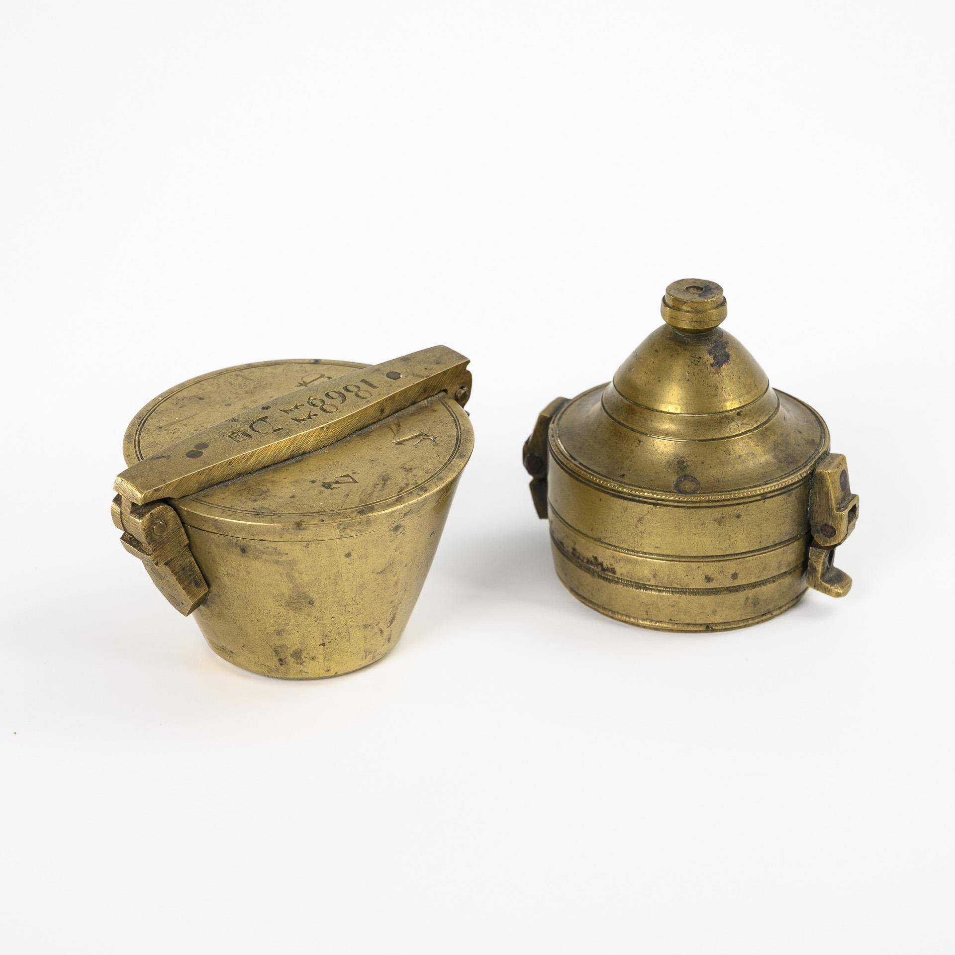 1-pound nested cup weight from 1868 with 8 original inserts (complete!). Each marked with monogram E and stag bars; additionally a "Z" on the house. / Russian stake weight with conical hinged lid. All parts hallmarked with the Russian eagle, the case back marked in Cyrillic Moscow with the letters F and VT. Case 48 solotniki, 4 insert weights marked 24, 12, 6 and 3 solotnik. Russian weight: The two smallest inserts and 1 locking pin missing. Otherwise slight signs of age/use.