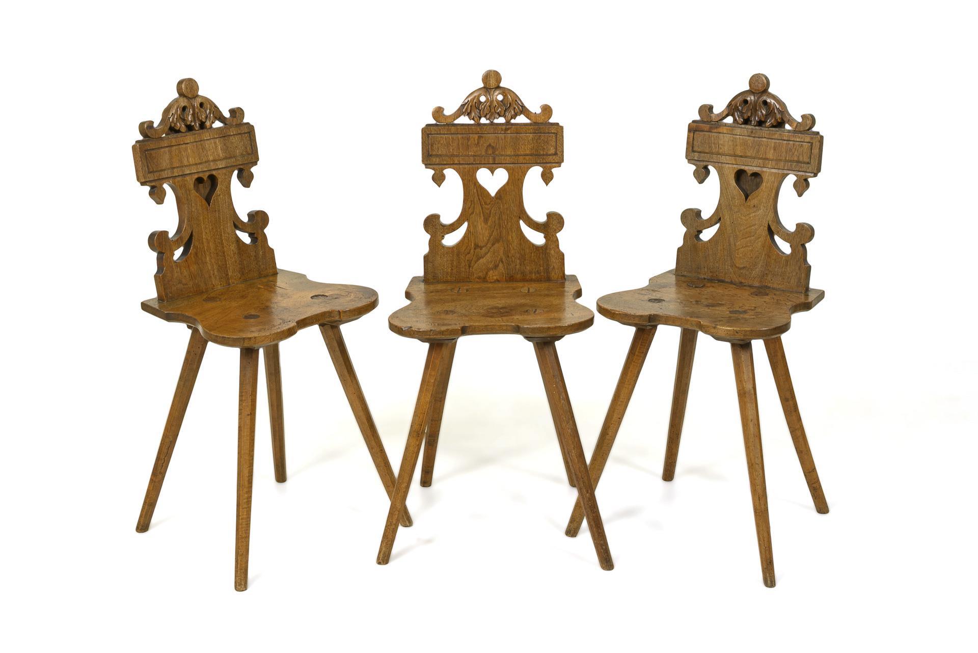 Peasant chairs with a silhouette that moves in form, florally carved backrests with a central heart motif, trapezoidal seats in a curved shape, each on 4 angled and canted pointed legs. Restored, with additions and repairs. Signs of use and slight defects, inactive anobia.