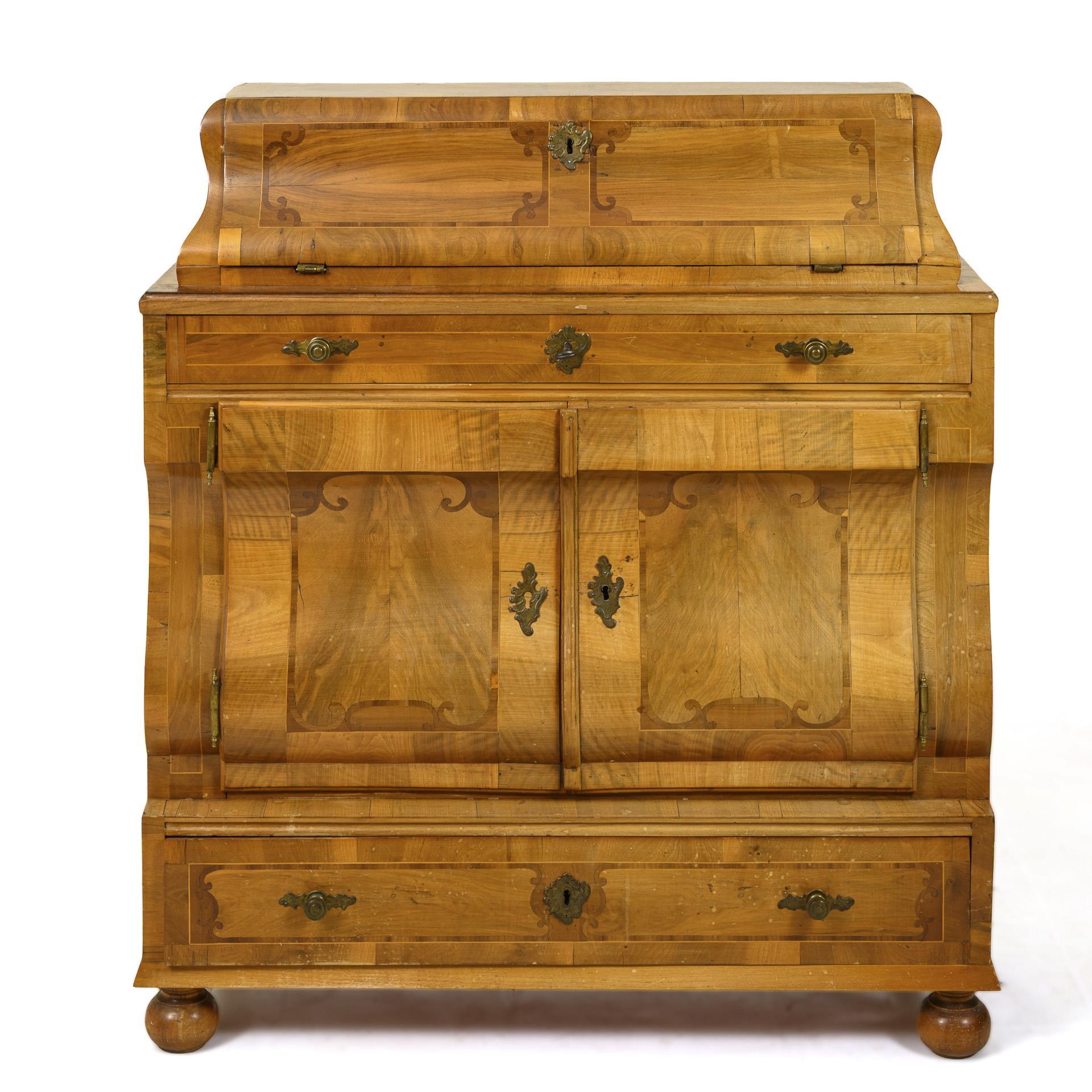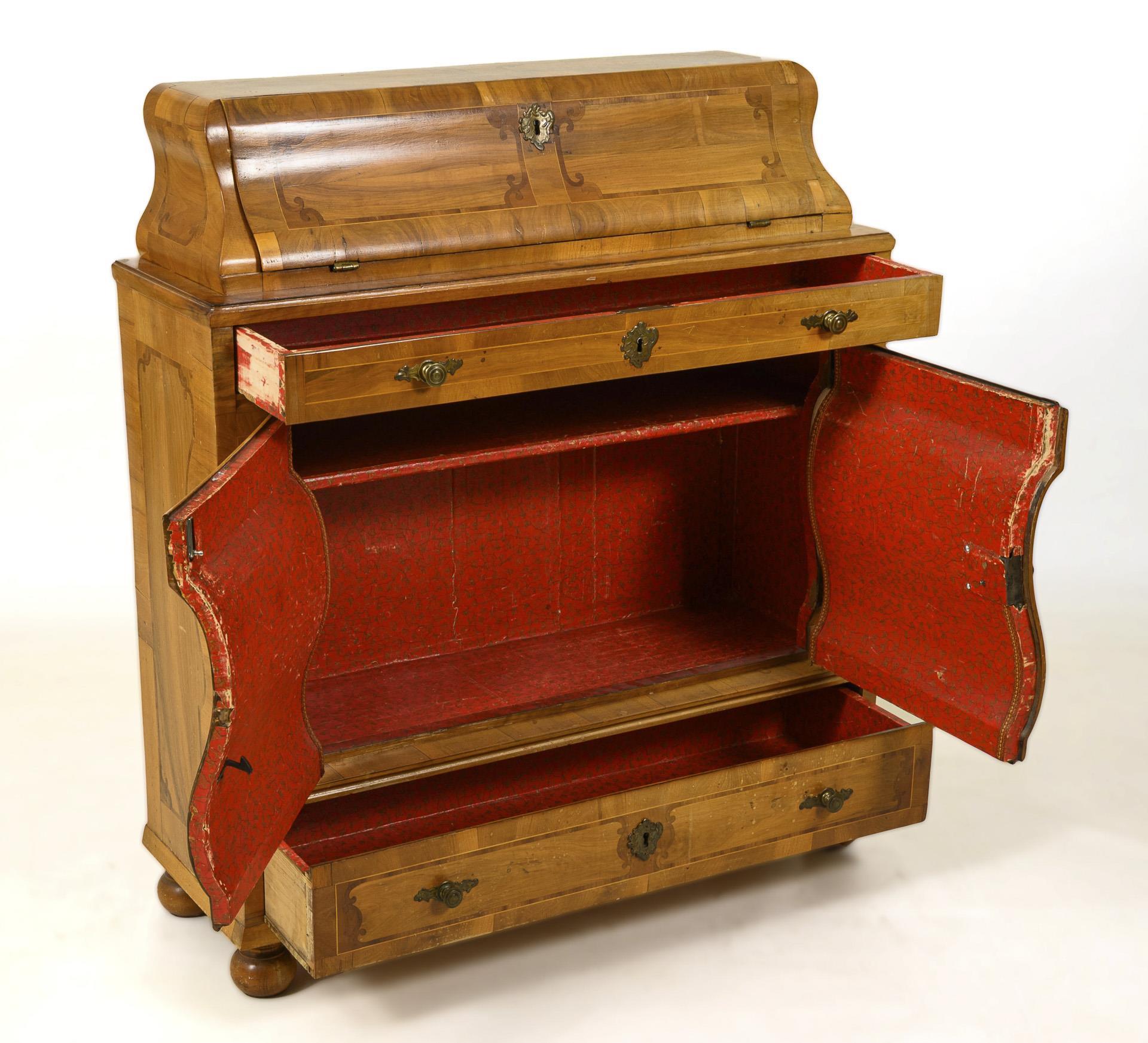Custom-made desk in wave form with concave curved and edged elements, with a hinged writing surface, 2 drawers and 2 front doors, on 4 spherical legs. Mock cassettes with voluted ribbon inlays and light thread inlays. Floral brass fittings and knobs. Interior with red paper lining with flowered pattern, writing compartment with 4 small drawers, storage compartment with 1 shelf. Restored, with additions. Signs of age and wear, partial veneer defects.