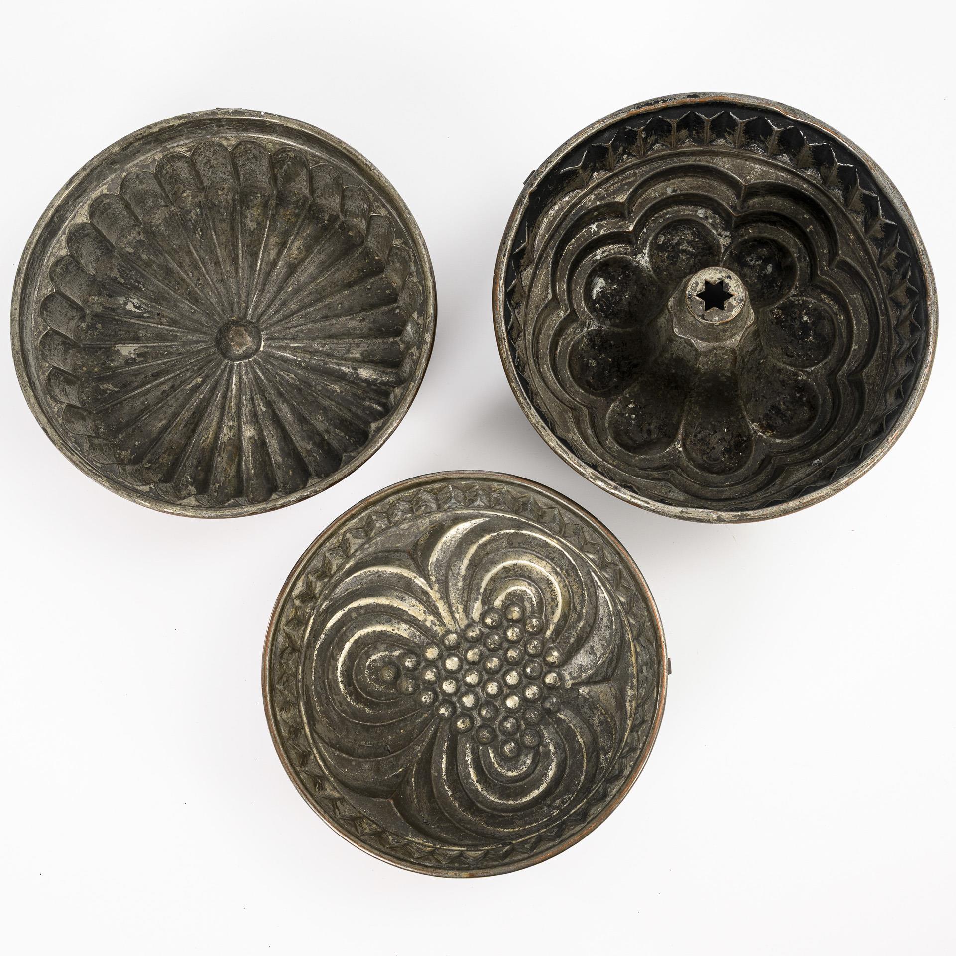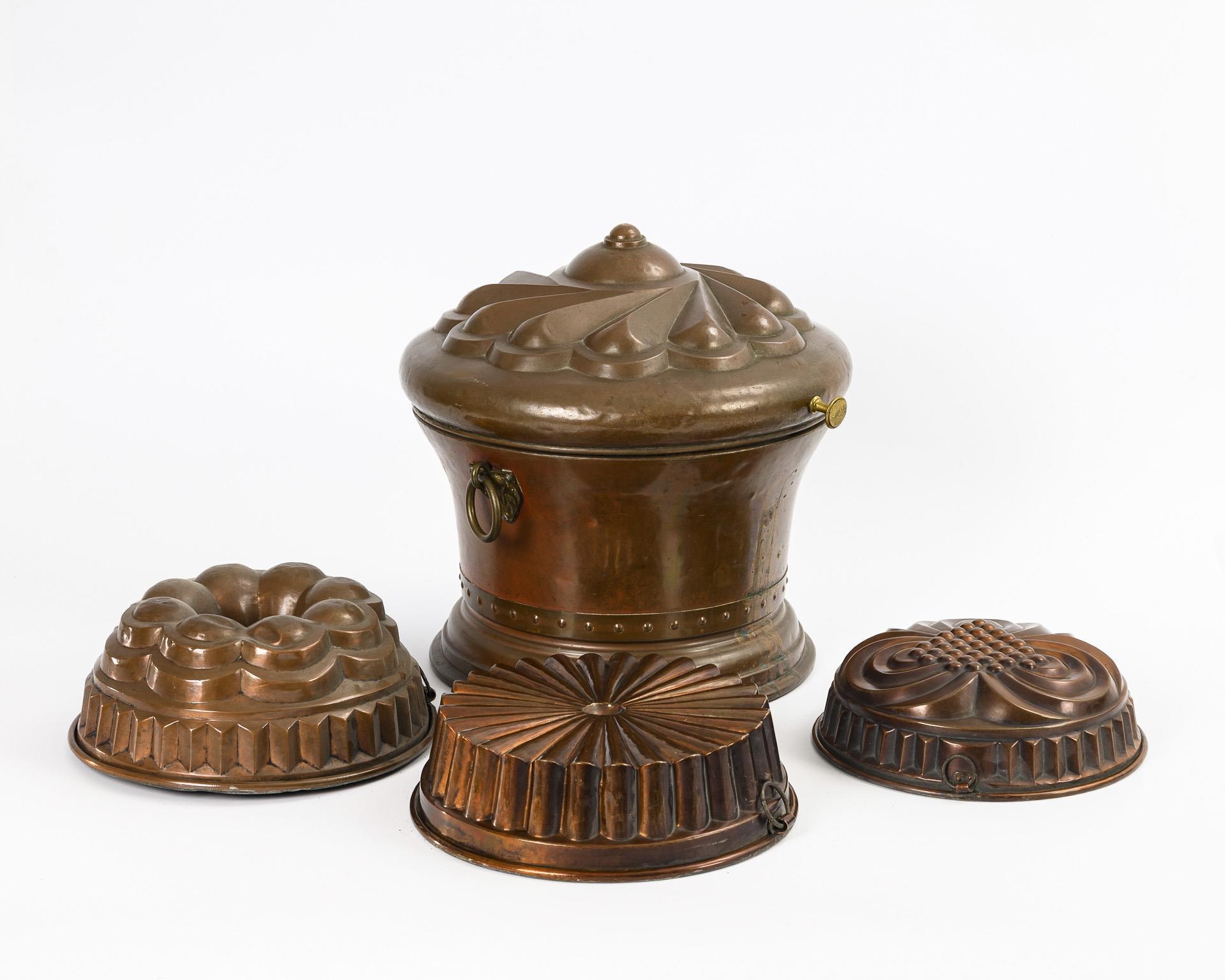Large bread container with godroned hinged lid and brass ring handles and knob / 3 decorated baking tins, including 1 bundt cake; each with iron ring handle. Slight signs of age/use.