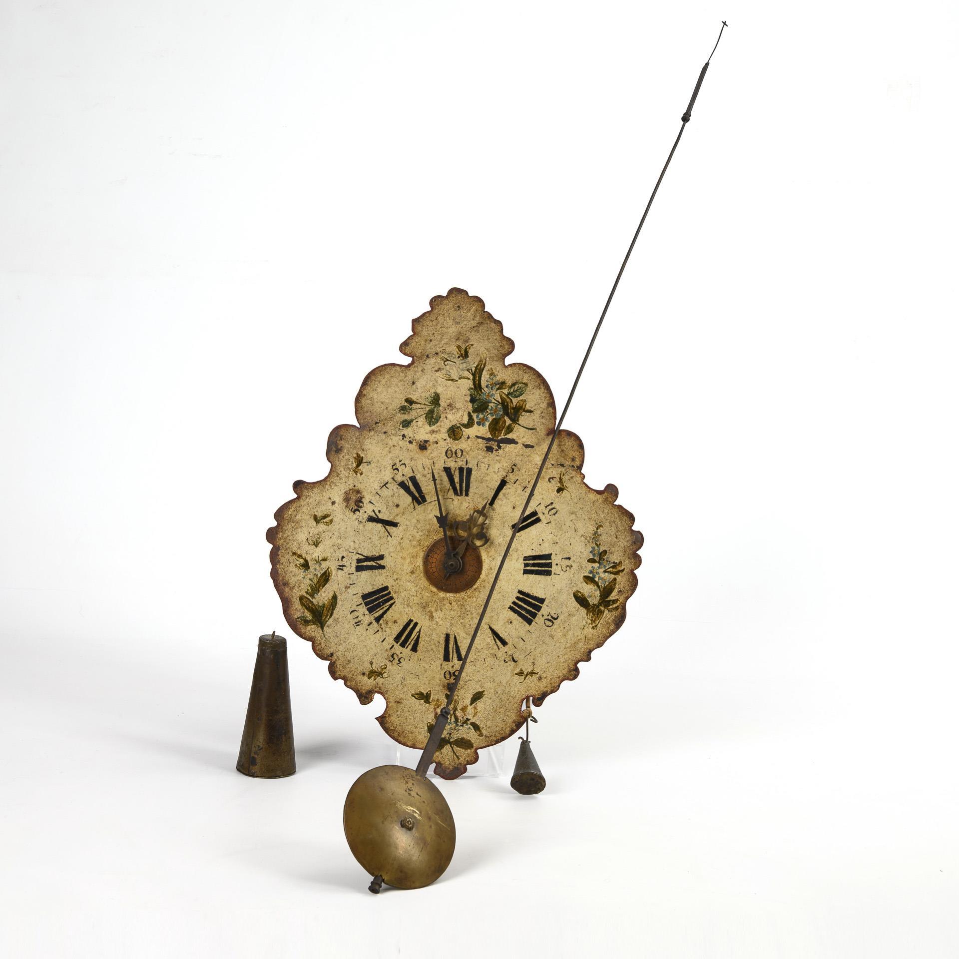 Rococo wall clock with curved iron shield, painted white and painted in color with branches and flowers. Dial ring with Roman and Arabic numerals, central brass dial for striking, floral iron hands. Signs of age and wear.
